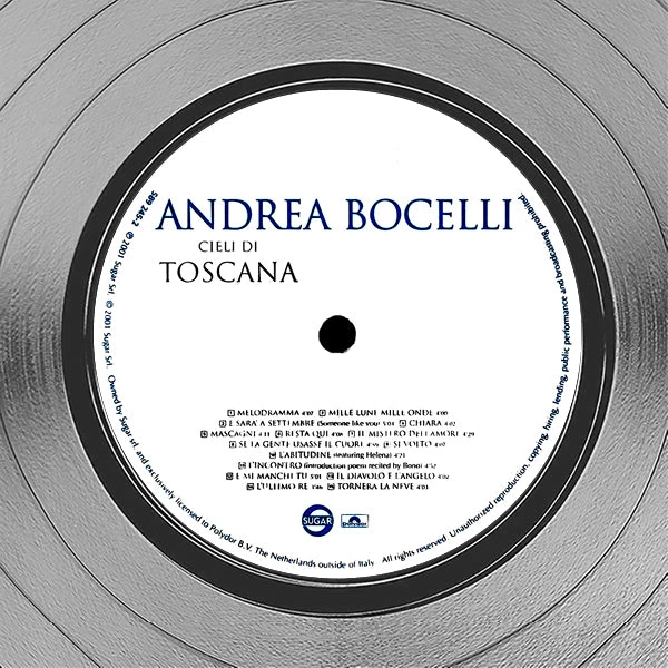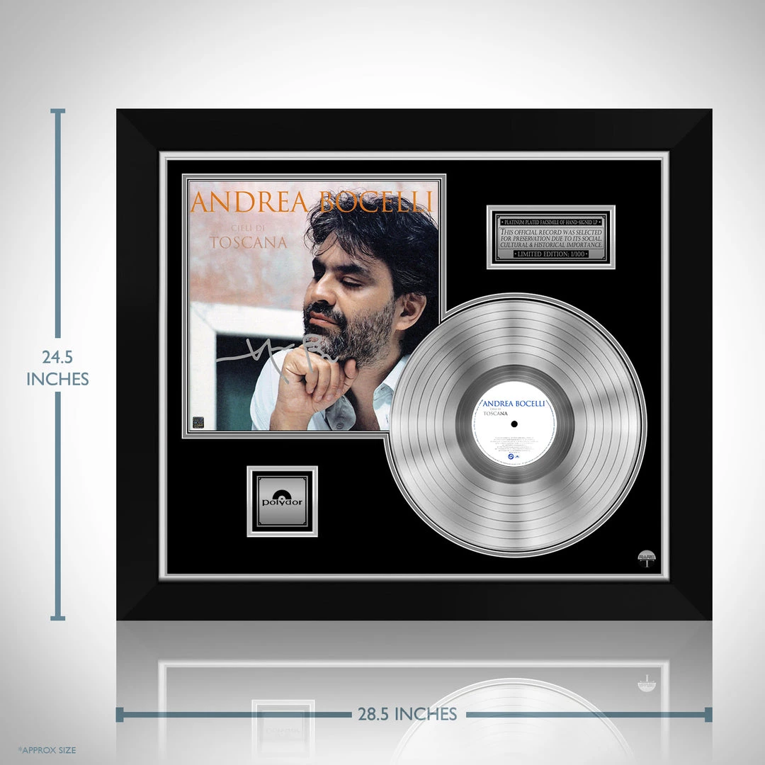 Pay homage to one of the most iconic Italian opera tenor of all time Andrea Bocelli , with this gallery-framed, authentic Polydor Records fully licensed facsimile of the official Hand-Signed Platinum Plated LP Record and LP Cover Cieli Di Toscana Originally signed by Andrea Bocelli , of which is strictly limited to 100 units Worldwide and has been approved and numbered accordingly.