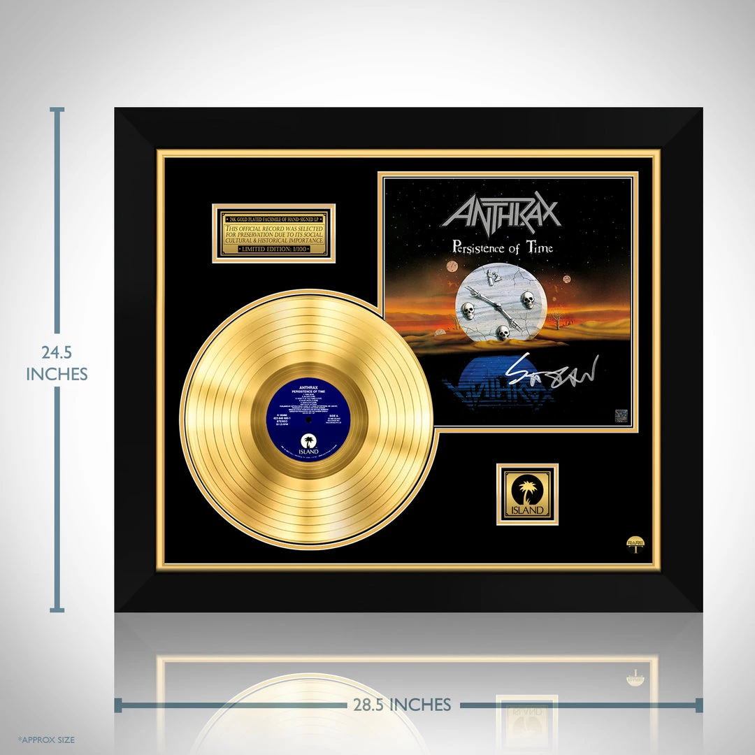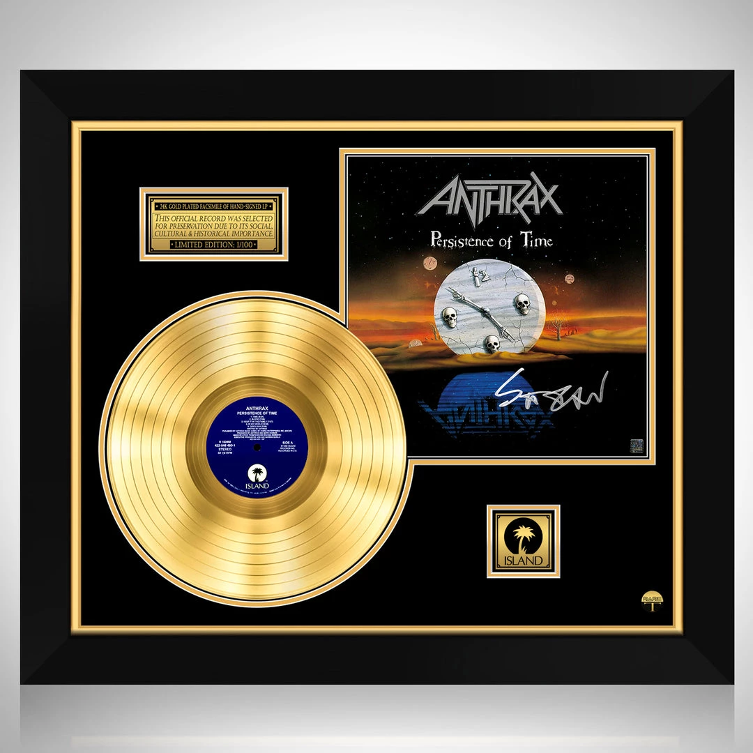 Pay homage to one of the most iconic band of all time Anthrax , with this gallery-framed, authentic Island records fully licensed facsimile of the official Hand-Signed 24K Gold Plated LP Record and LP Cover Persistence of Time Originally signed by Scott Ian , of which is strictly limited to 100 units Worldwide and has been approved and numbered accordingly.
