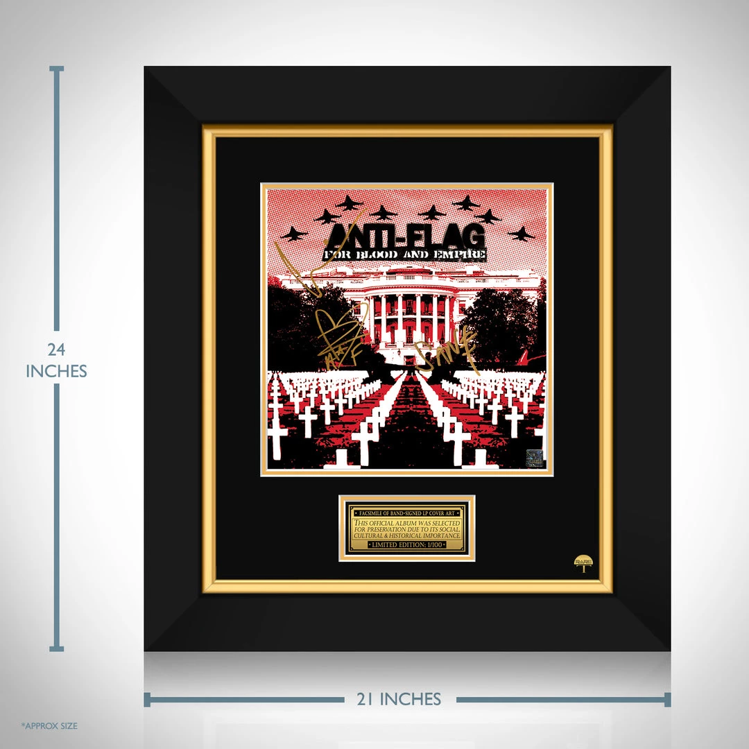 Pay homage to one of the most iconic American punk-rock band of all time, Anti-Flag , with this gallery-framed, officially licensed, limited edition facsimile of the Hand-Signed For blood and empire LP Cover originally signed by Justin Sane, Chris Head & Chris #2 , of which is strictly limited to 100 units Worldwide, and has been approved and numbered accordingly.