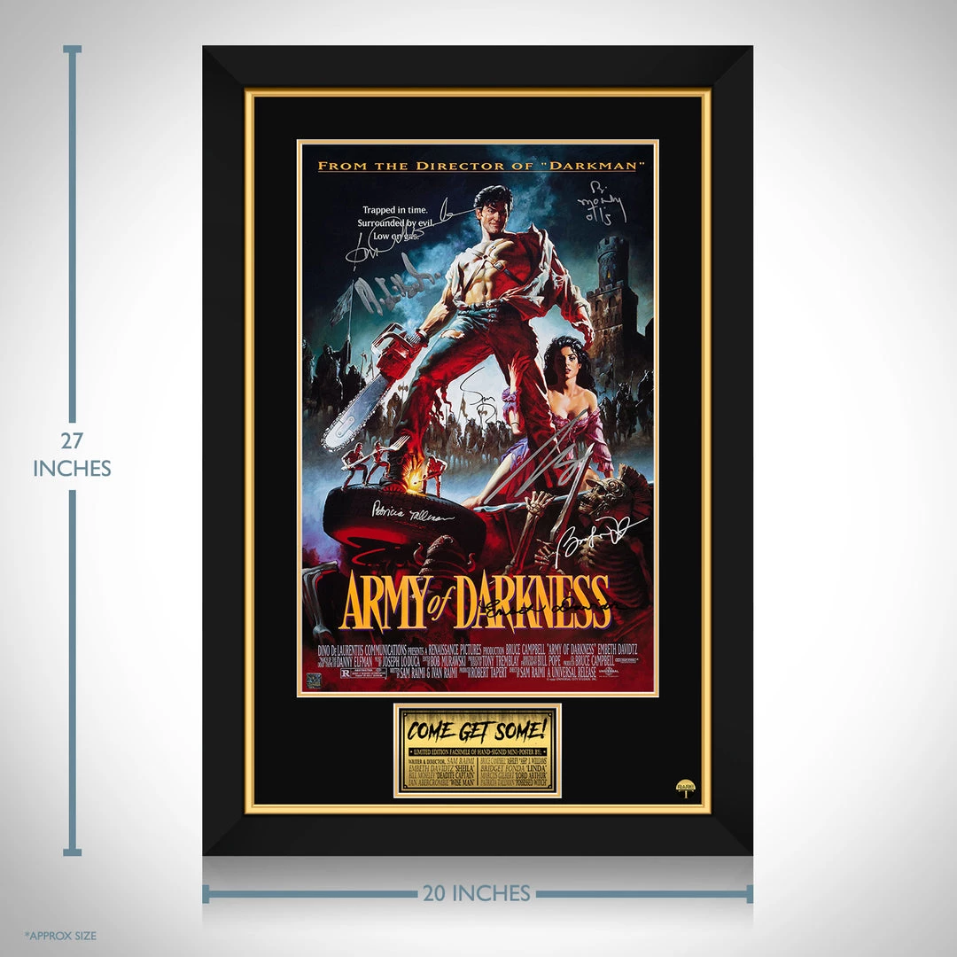 Pay homage to one of the most iconic films of all time, Army of Darkness, with this gallery-framed, officially licensed, limited edition facsimile of hand-signed movie mini poster, originally signed by Sam Raimi, Embeth Davidtz, Bill Moseley, Ian Abercrombie, Bruce Campbell, Bridget Fonda, Marcus Gilbert and Patricia Tallman, of which is strictly limited to 100 units Worldwide, and has been approved and numbered accordingly.