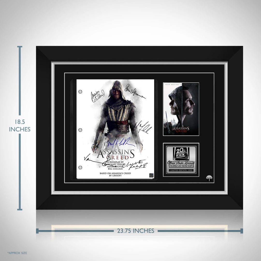 Pay homage to Assassin’s Creed , with this 20th Century Fox fully licensed facsimile of the official signed movie script, originally signed by actors Michael Fassbender, Marion Cotillard, Jeremy Irons, Brendan Gleeson, Charlotte Rampling & Michael Kenneth Williams , of which is strictly limited to 100 units Worldwide and has been approved and numbered accordingly.