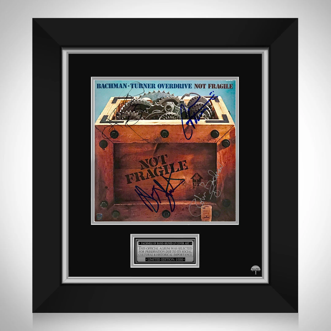 Pay homage to one of the most iconic Canadian rock group of all time, Bachman Turner Overdrive , with this gallery-framed, officially licensed, limited edition facsimile of the Hand-Signed Not fragile LP Cover originally signed by Randy Bachman, Robbie Bachman, Blair Thornton & C.F. Turner , of which is strictly limited to 100 units Worldwide, and has been approved and numbered accordingly.