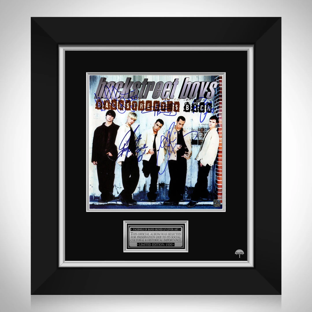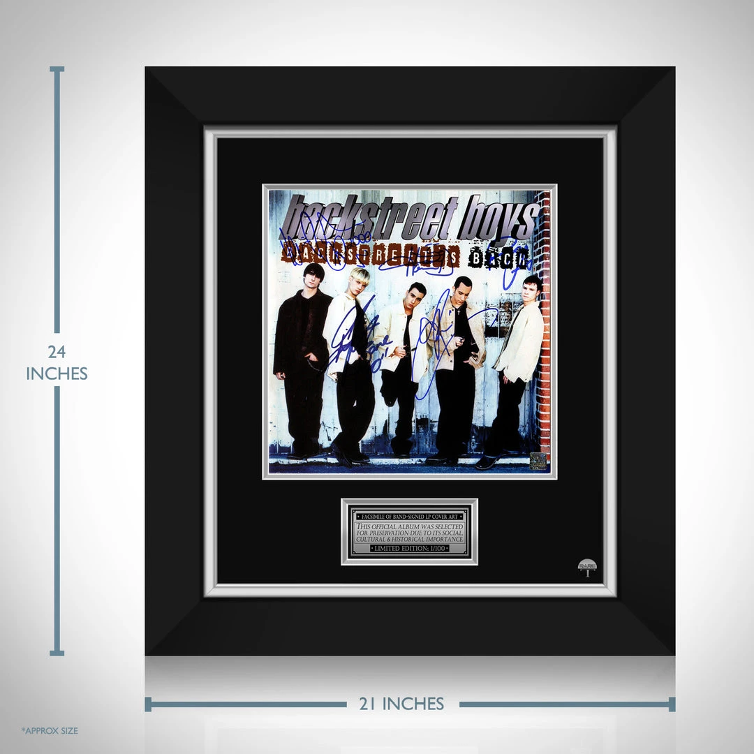 Pay homage to one of the most iconic American vocal group of all time, Backstreet Boys , with this gallery-framed, officially licensed, limited edition facsimile of the Hand-Signed Backstreet Back LP Cover originally signed by Nick Carter, Howie Dorough, Brian Littrell, AJ McLean & Kevin Richardson , of which is strictly limited to 100 units Worldwide, and has been approved and numbered accordingly.