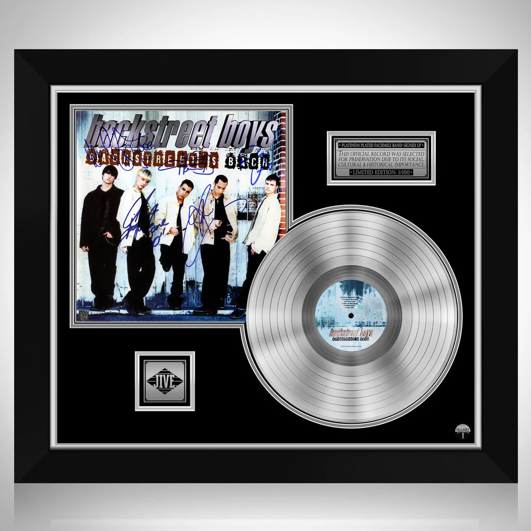 Pay homage to one of the most iconic American vocal group of all time Backstreet Boys , with this gallery-framed, authentic Jive Records fully licensed facsimile of the official Hand-Signed Platinum Plated LP Record and LP Cover Backstreet Back Originally signed by Nick Carter, Howie Dorough, Brian Littrell, AJ McLean & Kevin Richardson , of which is strictly limited to 100 units Worldwide and has been approved and numbered accordingly.