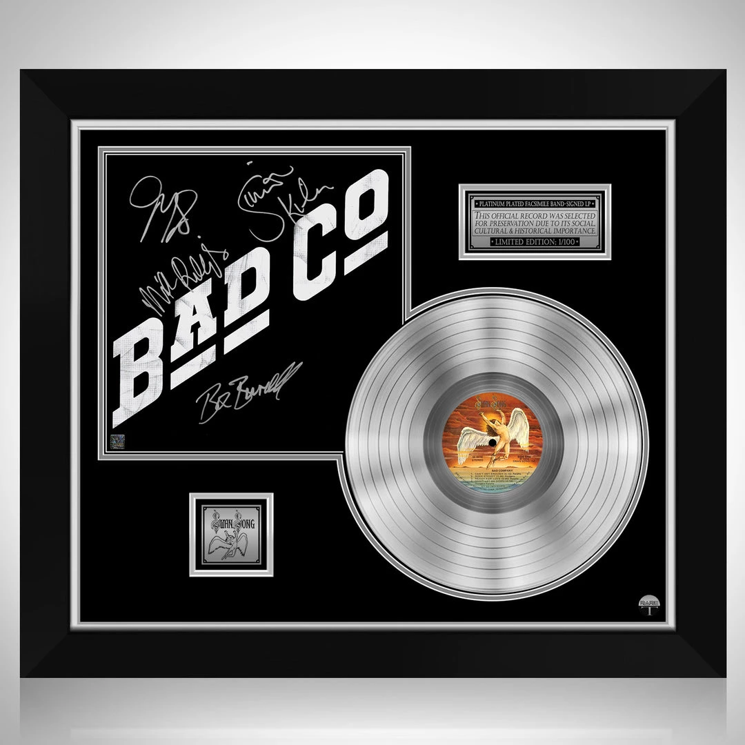 Pay homage to one of the most iconic English hard rock supergroup of all time Bad Company , with this gallery-framed, authentic Swan Song Records fully licensed facsimile of the official Hand-Signed Platinum Plated LP Record and LP Cover Self-titled Originally signed by Paul Rodgers, Mick Ralphs, Simon Kirke & Boz Burrel , of which is strictly limited to 100 units Worldwide and has been approved and numbered accordingly.