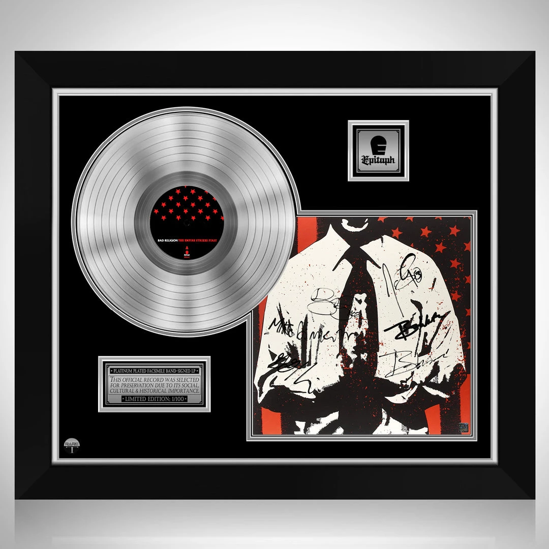 Pay homage to one of the most iconic American punk rock band of all time Bad Religion , with this gallery-framed, authentic Epitaph Records fully licensed facsimile of the official Hand-Signed Platinum Plated LP Record and LP Cover The Empire Strikes First Originally signed by Greg Graffin, Greg Hetson, Brian Baker, Brett Gurewitz, Brooks Wackerman & Jay Bentley , of which is strictly limited to 100 units Worldwide and has been approved and numbered accordingly.