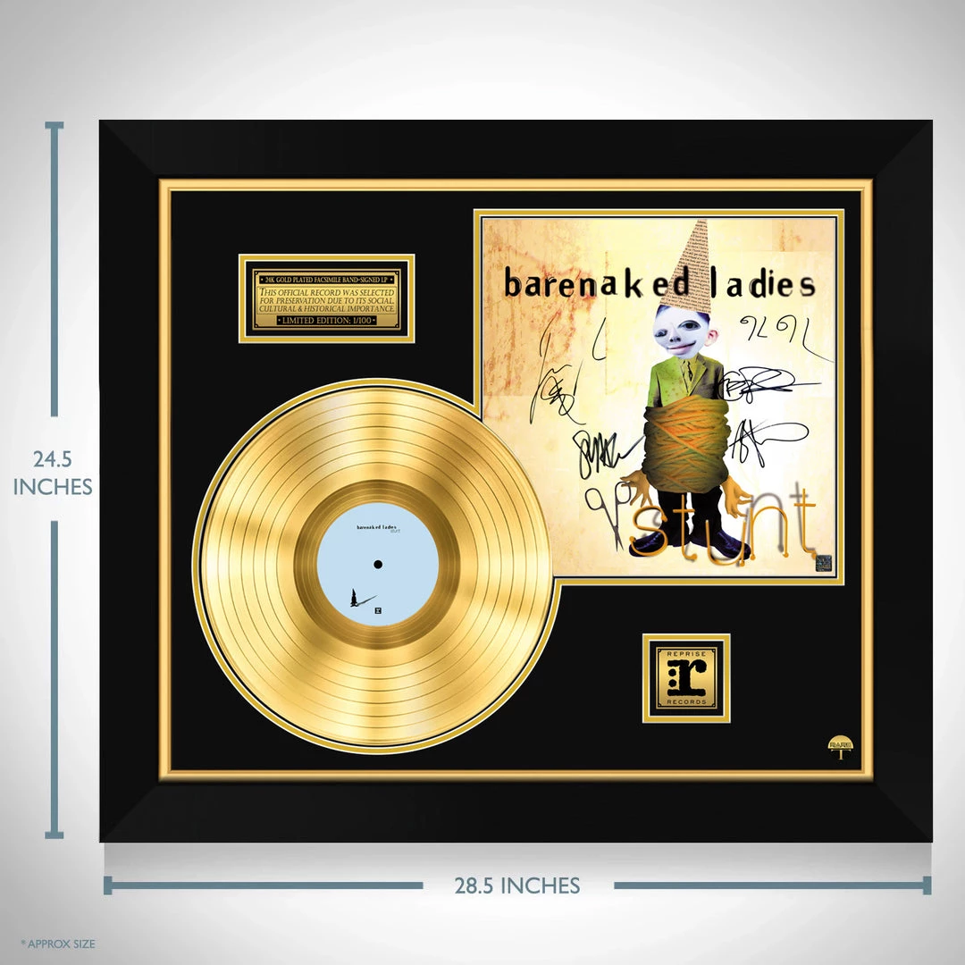 Pay homage to one of the most iconic band of all time Barenaked Ladies , with this gallery-framed, authentic, Reprise Records fully licensed facsimile of the official Hand-Signed 24k Gold Plated LP Record and LP Cover “Stunt” Originally signed by Ed Robertson, Jim Creeggan, Tyler Stewart, Kevin Hearn & Steven Page, of which is strictly limited to 100 units Worldwide and has been approved and numbered accordingly.