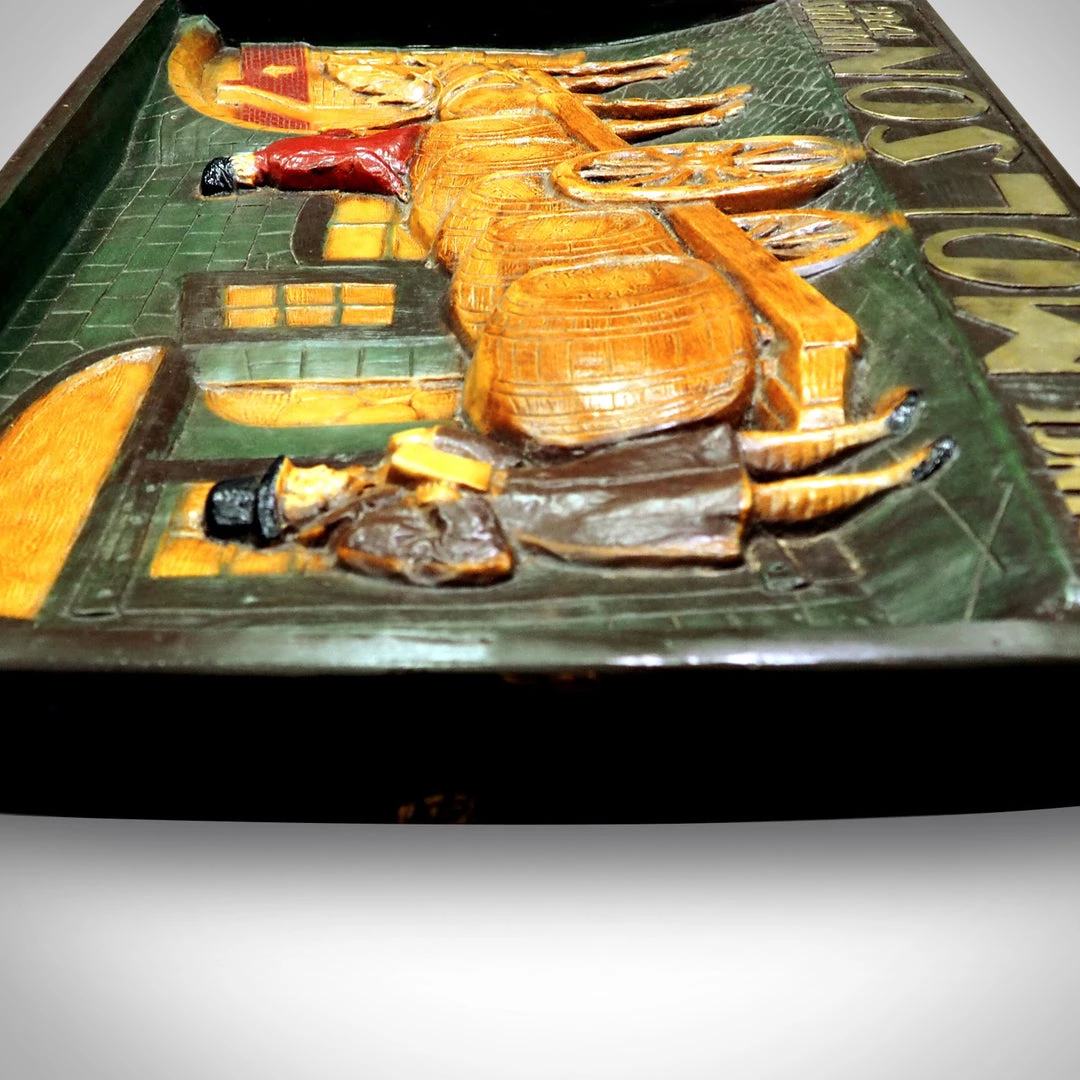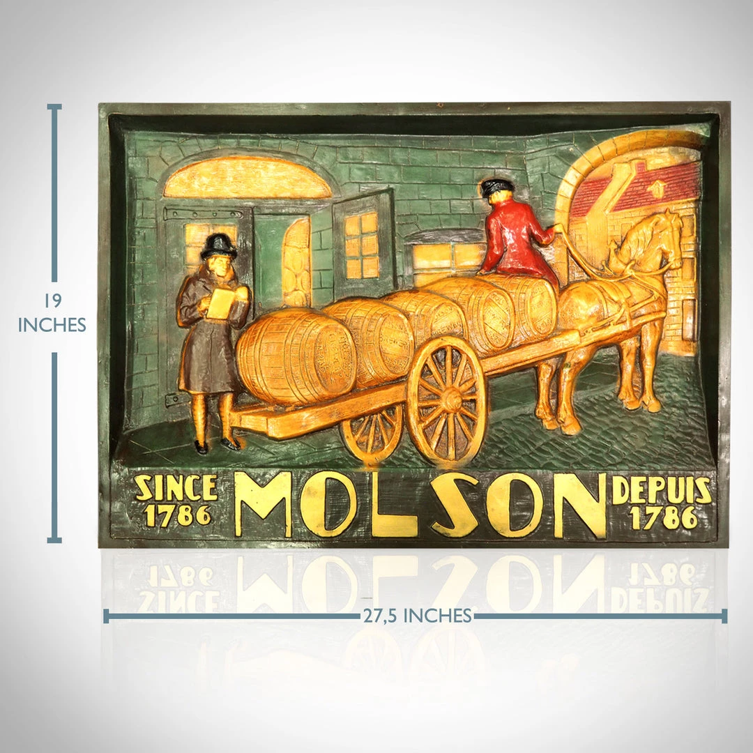 This original vintage pressed-foam ‘MOLSON – HORSE-DRAWN KEG CART‘ Beer Display/Advertisement will make a great addition to any home bar or to set off on its own in a place of honor. Representing the iconic Canadian company’s imagery in its early days, established in 1786, which happens to also be embossed on the front, in both English and French – all of which are highlighted by perfectly aged and patina’d gold/brass lettering and hand-painted details.
