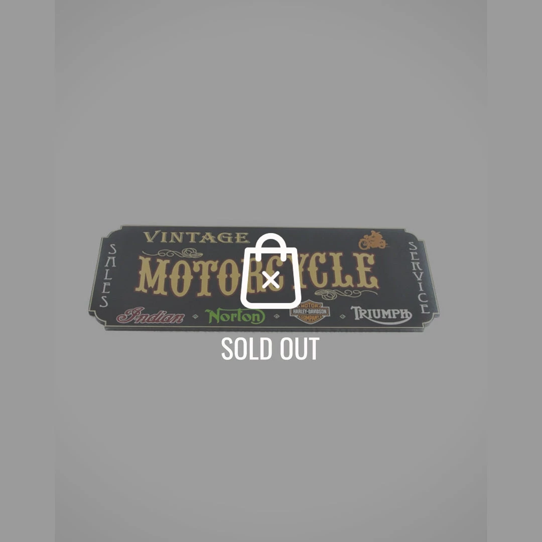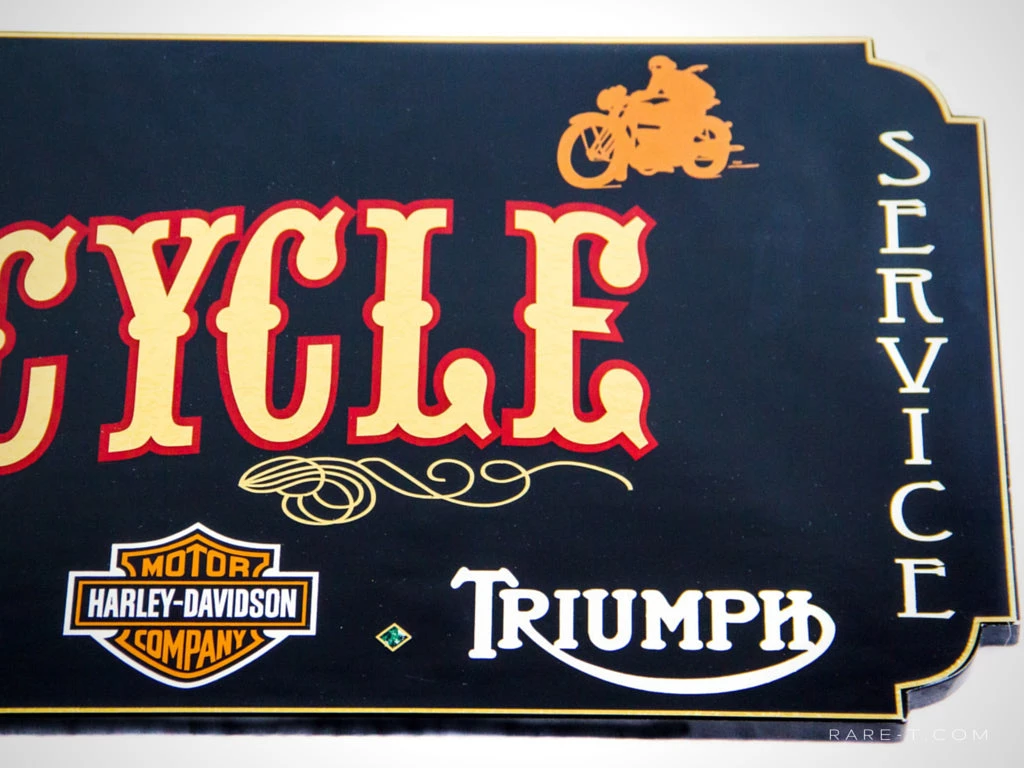 This is a killer wood plank piece that’s hand-painted and highlighted with traditional gold leaf – ‘VINTAGE HARLEY-DAVIDSON, NORTON, TRIUMPH, INDIAN MOTORCYCLE’ Dealership sign.