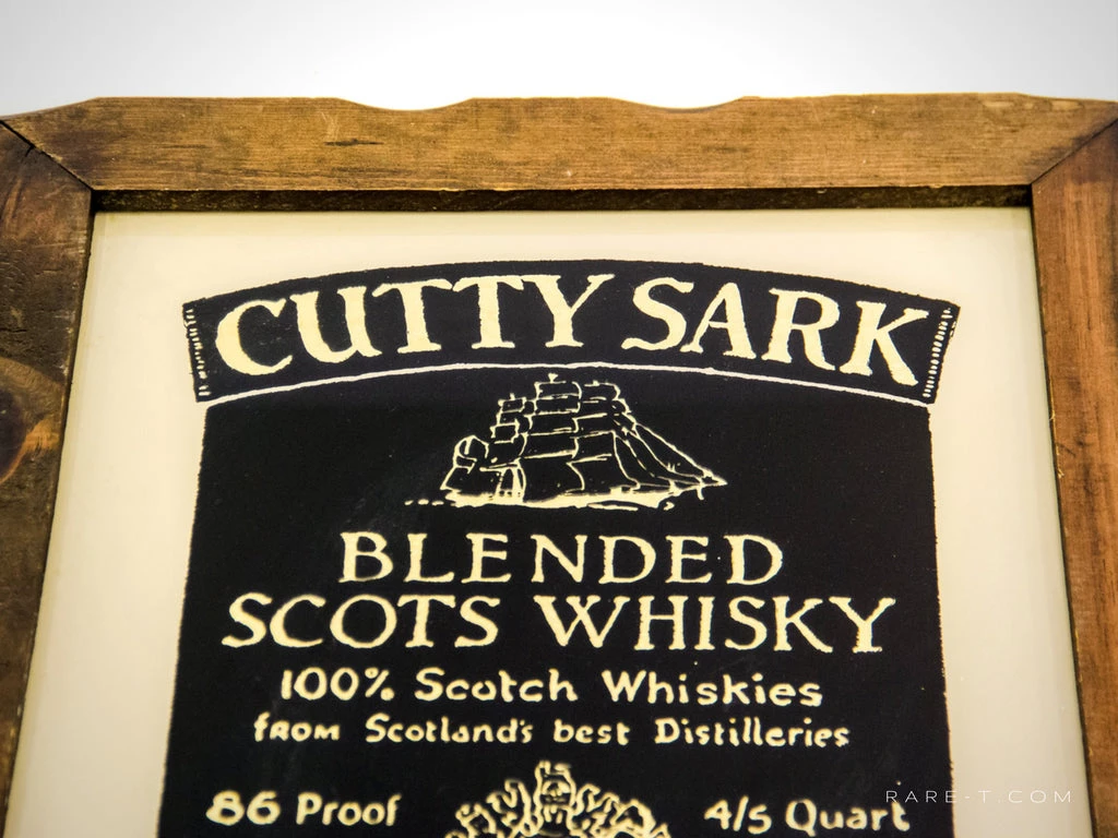 This vintage REVERSE PAINTED ‘CUTTY SARK-SCOTS WHISKY’ SCOTCH WHISKIES Bar/Tavern/Pub Mirror/Advertisement, features the brightly colored iconic CUTTY SARK imagery, sail-ship, as well as the ‘BLENDED SCOTS WHISKY – 100% Scotch Whiskies from Scotland’s best Distilleries’ brand slogan – all of which highlighted by the original dark wood frame.