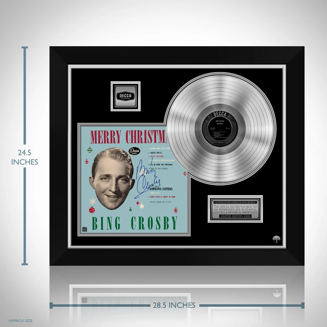 Pay homage to one of the most iconic American singer of all time Bing Crosby , with this gallery-framed, authentic Decca records fully licensed facsimile of the official Hand-Signed Platinum Plated LP Record and LP Cover Merry Christmas Originally signed by Bing Crosby , of which is strictly limited to 100 units Worldwide and has been approved and numbered accordingly.
