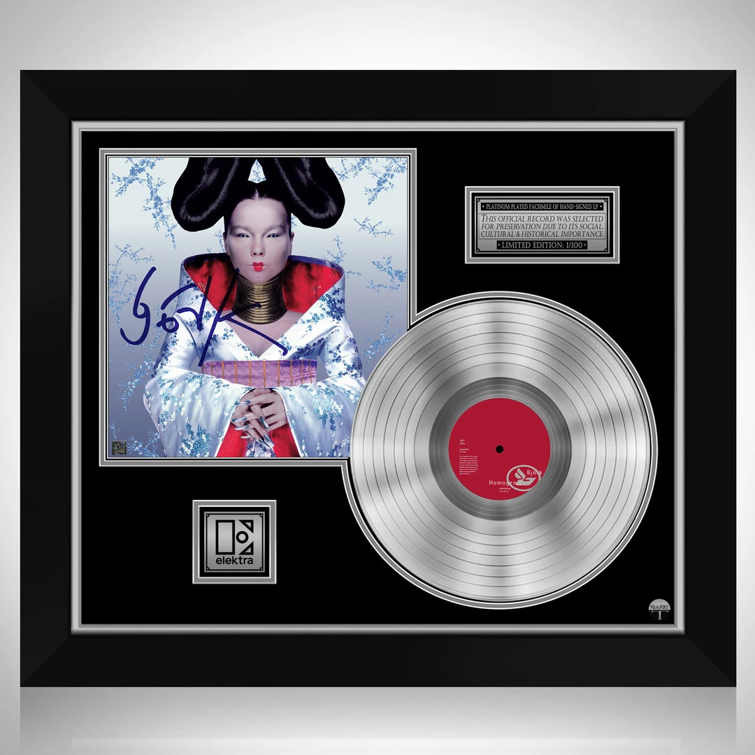 Pay homage to one of the most iconic American hip hop and rap rock group of all time Bjork , with this gallery-framed, authentic Elektra Records fully licensed facsimile of the official Hand-Signed Platinum Plated LP Record and LP Cover Homogenic Originally signed by Bjork , of which is strictly limited to 100 units Worldwide and has been approved and numbered accordingly.