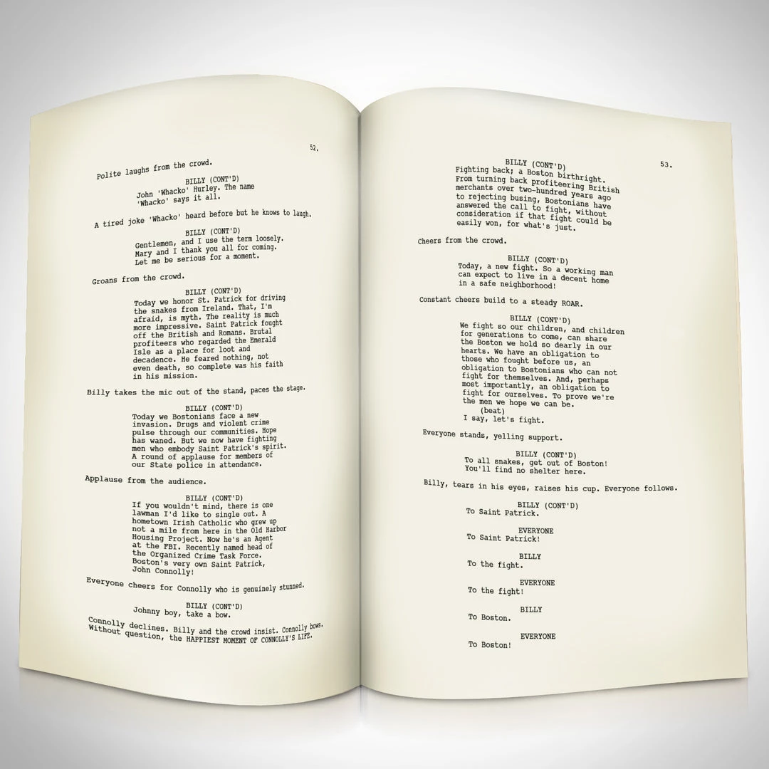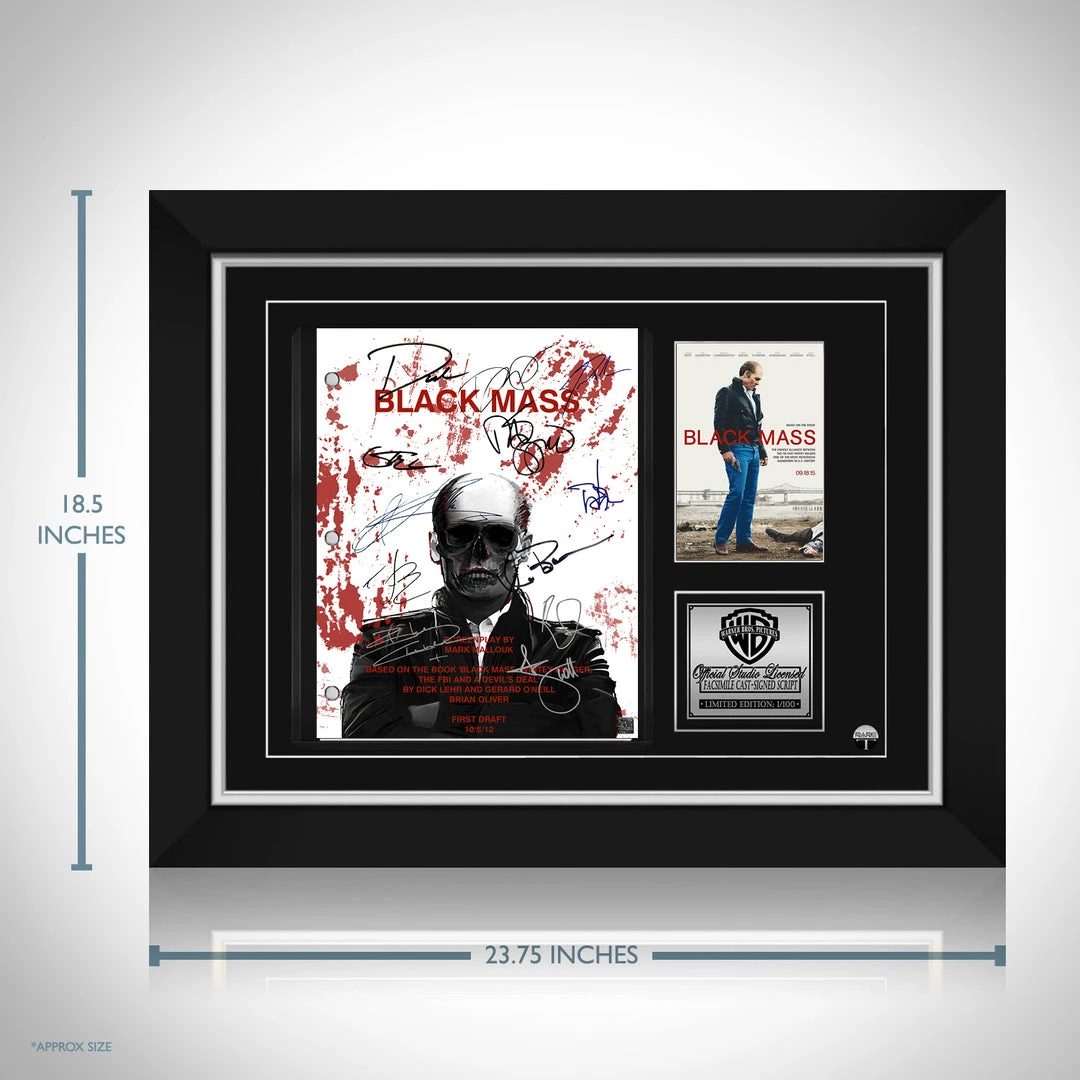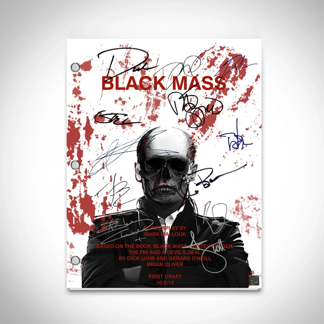 Pay homage to Black Mass , with this Warner Bros fully licensed facsimile of the official signed movie script, originally signed by actors Rory Cochrane, Johnny Depp, Joel Edgerton, Benedict Cumberbatch, Jesse Plemons, Kevin Bacon, Dakota Johnson, Peter Sarsgaard, David Harbour, Adam Scott, Corey Stoll & James Russo , of which is strictly limited to 100 units Worldwide and has been approved and numbered accordingly.