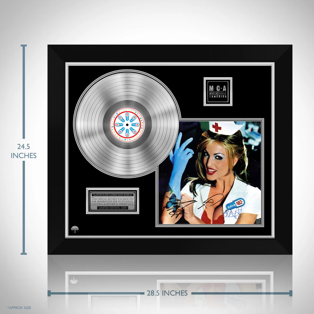 Pay homage to one of the most iconic American rock band of all time Blink-182 , with this gallery-framed, authentic MCA Records fully licensed facsimile of the official Hand-Signed Platinum Plated LP Record and LP Cover Enema of the State Originally signed by Travis Barker, Mark Hoppus & Tom Delonge , of which is strictly limited to 100 units Worldwide and has been approved and numbered accordingly.