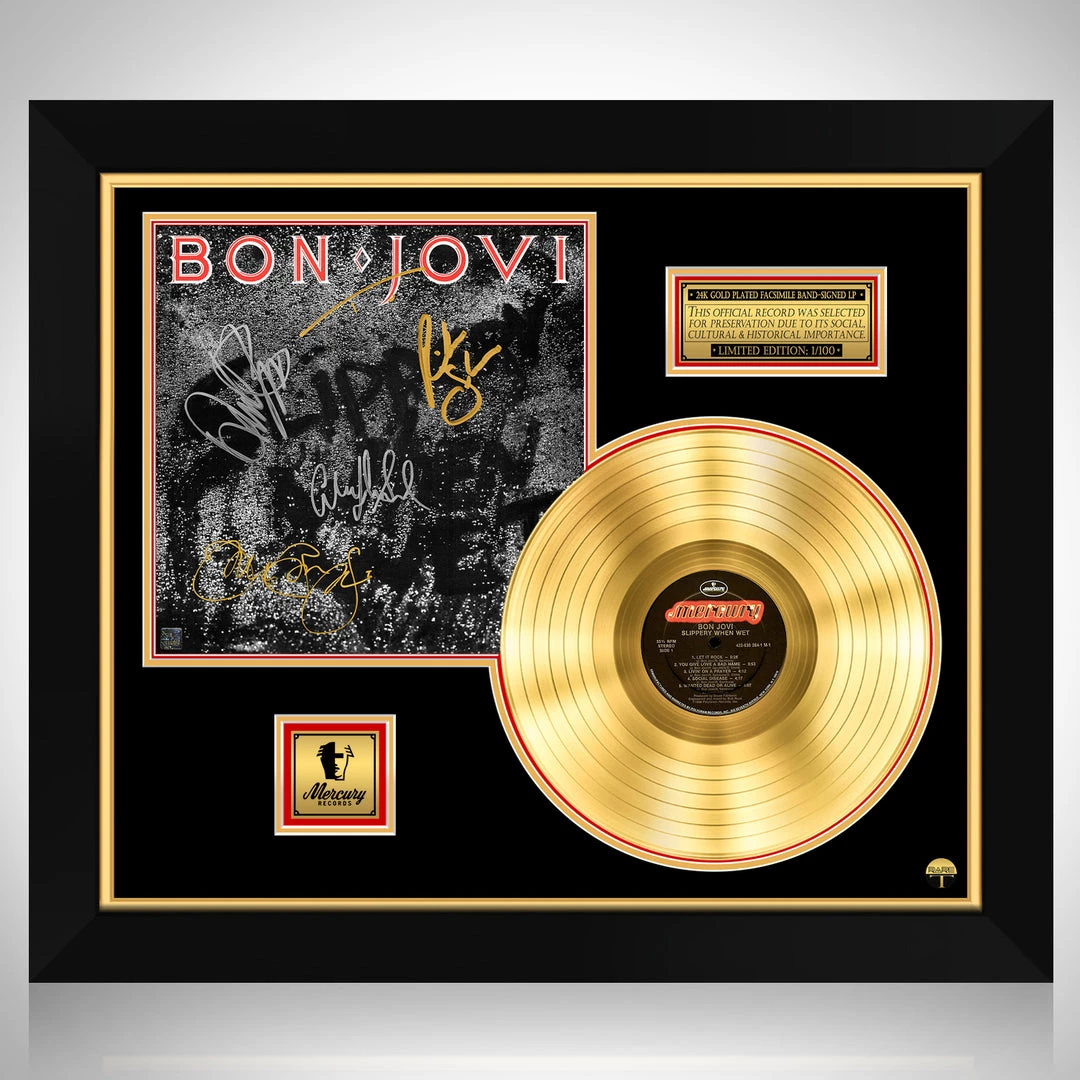 Pay homage to one of the most iconic American rock band of all time Bon Jovi , with this gallery-framed, authentic Mercury Records fully licensed facsimile of the official Hand-Signed 24K Gold LP Record and LP Cover Slippery when wet Originally signed by Jon Bon Jovi, Richie Sambora, Alec John Such, Tico Torres & David Bryan , of which is strictly limited to 100 units Worldwide and has been approved and numbered accordingly.
