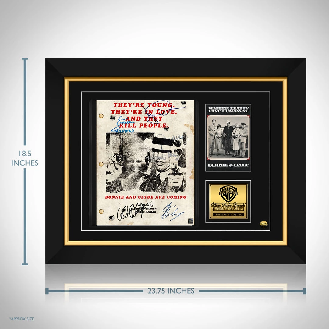 Pay homage to Bonnie and Clyde 1967 , with this Warner Bros. Pictures fully licensed facsimile of the official signed movie transcript, originally signed by actors Warren Beatty, Faye Dunaway, Michael J.Pollard, Gene Hackman, Estelle Parsons & Gene Wilder , of which is strictly limited to 100 units Worldwide and has been approved and numbered accordingly.