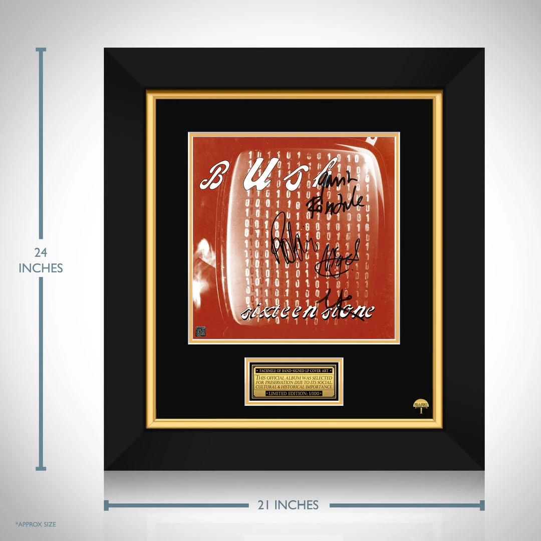 Pay homage to one of the most iconic British rock band of all time, Bush , with this gallery-framed, officially licensed, limited edition facsimile of the Hand-Signed Sixteen Stone LP Cover originally signed by Gavin Rossdale, Nigel Pulsford, Dave Parsons & Robin Goodridge , of which is strictly limited to 100 units Worldwide, and has been approved and numbered accordingly.