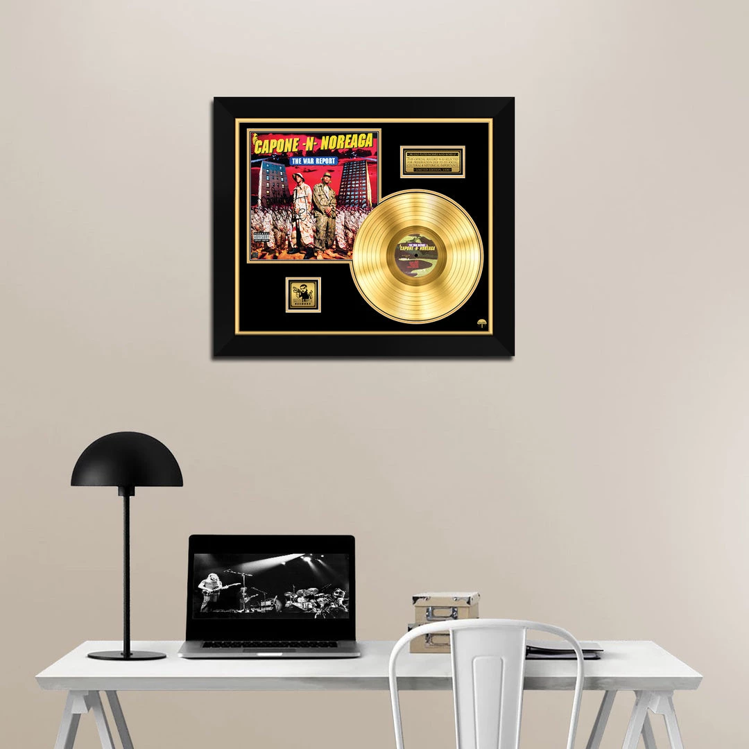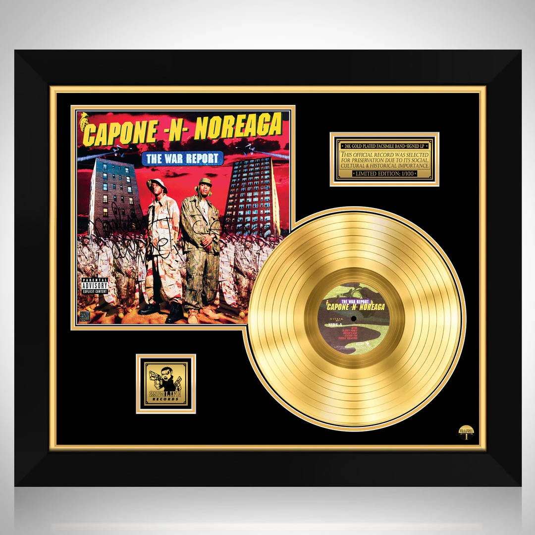Pay homage to one of the most iconic American hip hop duo of all time Capone -N- Noreaga , with this gallery-framed, authentic Penalty Recordings fully licensed facsimile of the official Hand-Signed 24K Gold LP Record and LP Cover The War Report Originally signed by Capone & Noreaga , of which is strictly limited to 100 units Worldwide and has been approved and numbered accordingly.