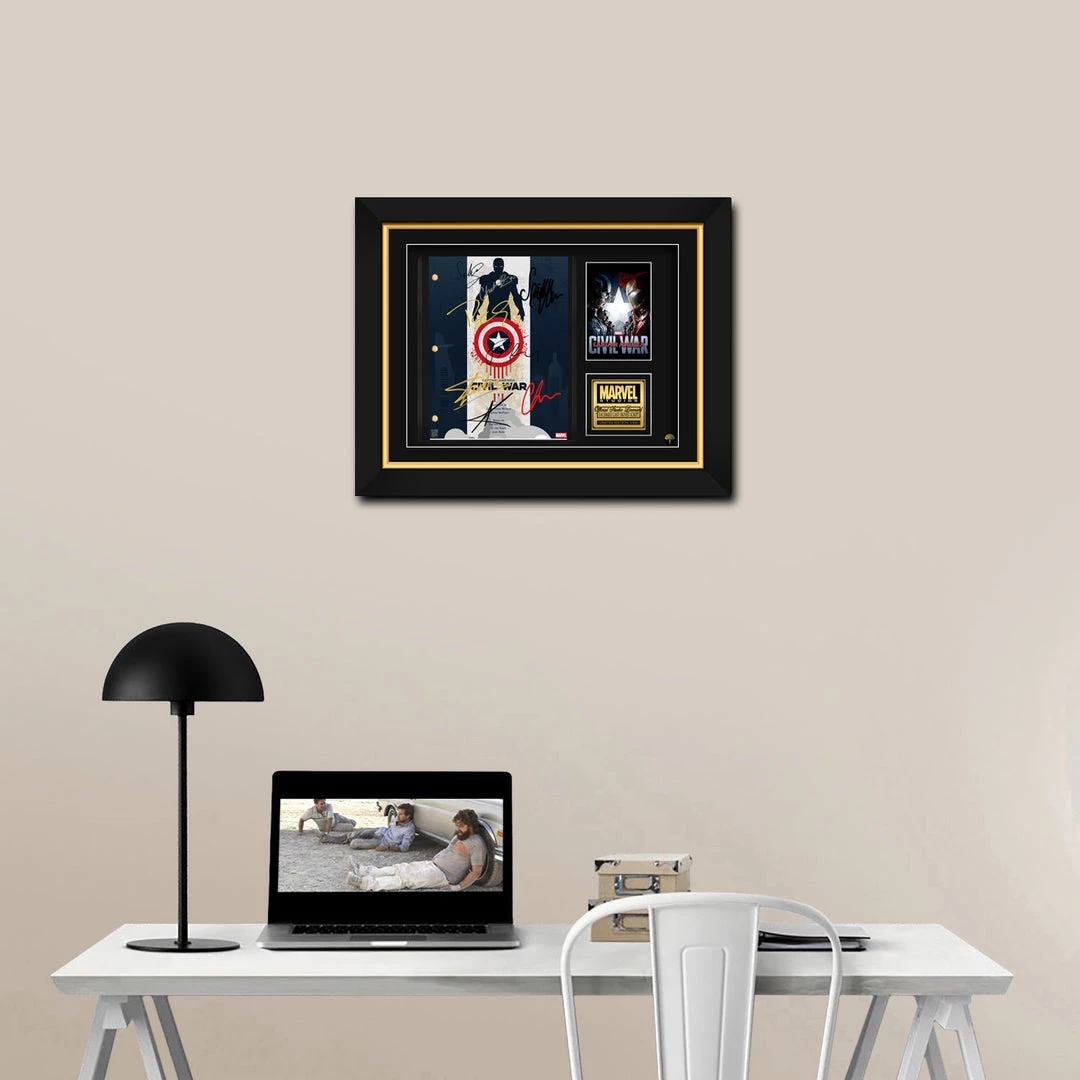 — Collector Grade Proprietary Exclusive VELVET TOUCH water/scratch resistant cover. — Collectible Facsimile of Original Hand-Signed Captain America Civil War movie Script Custom Frame.