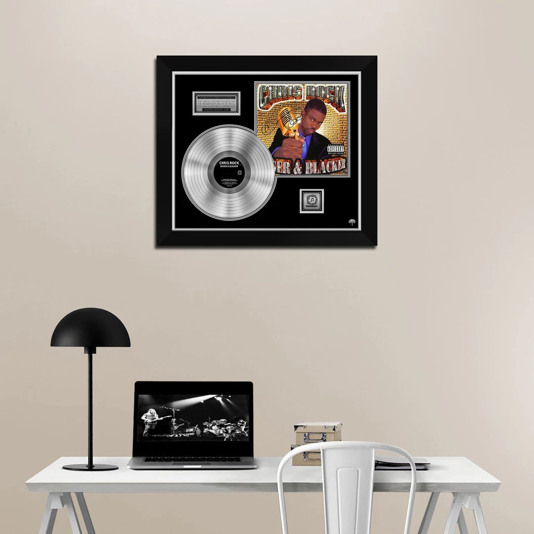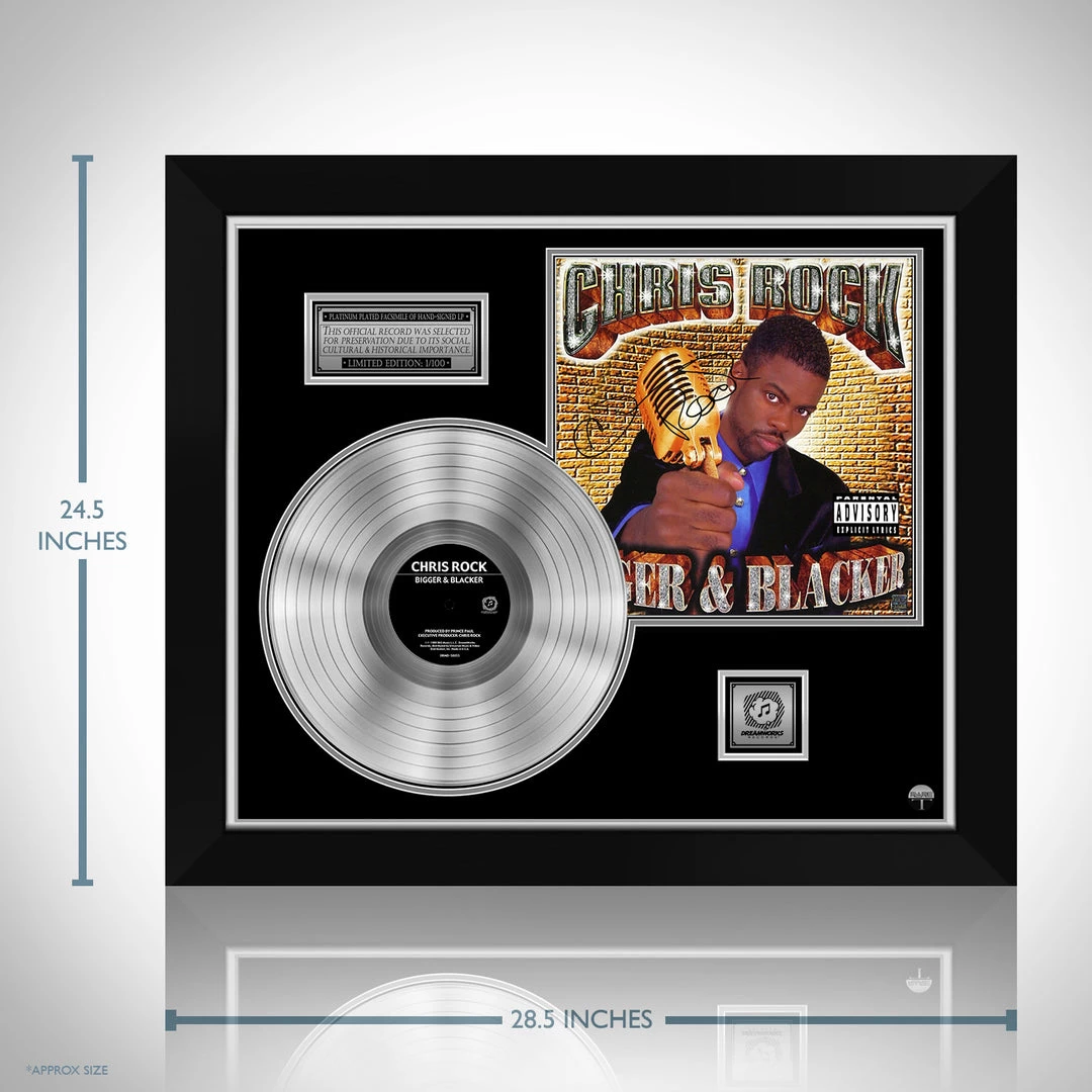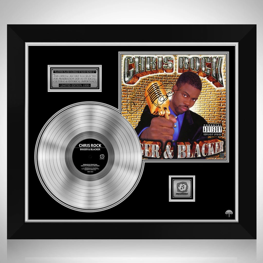 Pay homage to one of the most iconic television special of all time Chris Rock , with this gallery-framed, authentic Dreamworks Records fully licensed facsimile of the official Hand-Signed Platinum Plated LP Record and LP Cover Bigger & Blacker Originally signed by Chris Rock , of which is strictly limited to 100 units Worldwide and has been approved and numbered accordingly.