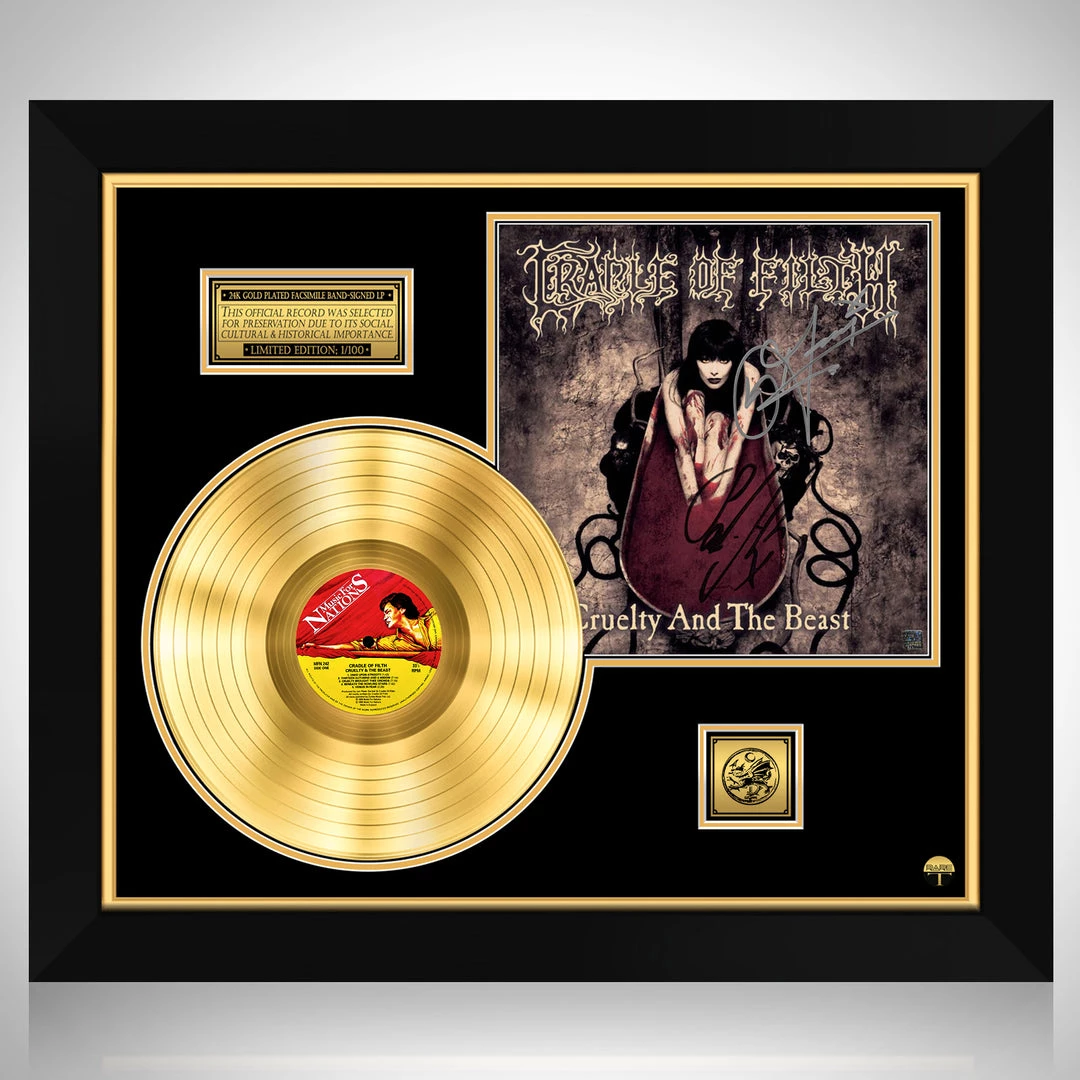 Pay homage to one of the most iconic English extreme metal band of all time Cradle of filth , with this gallery-framed, authentic Music for Nations fully licensed facsimile of the official Hand-Signed 24K Gold LP Record and LP Cover Cruelty and the Beast Originally signed by Dani Filth & Sarah Jezebel Deva , of which is strictly limited to 100 units Worldwide and has been approved and numbered accordingly.