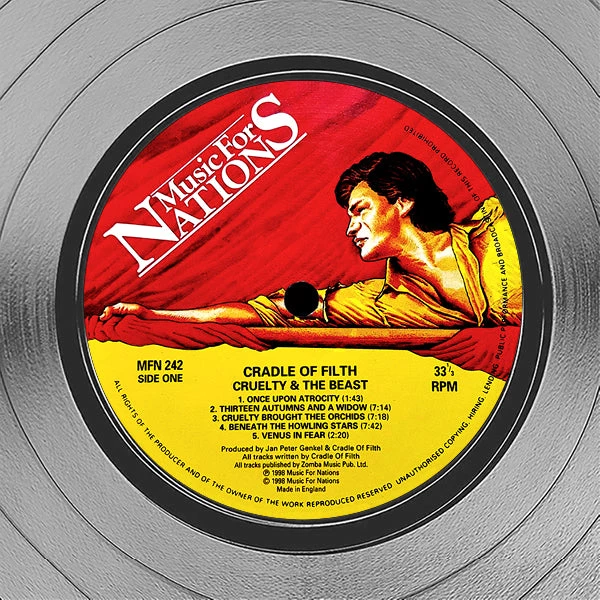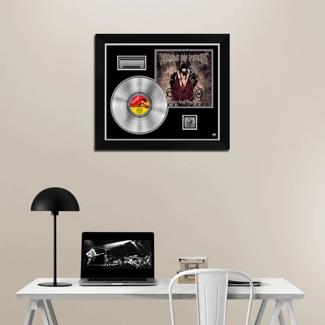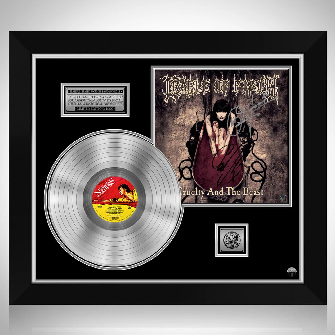 Pay homage to one of the most iconic English extreme metal band of all time Cradle of filth , with this gallery-framed, authentic Music for Nations fully licensed facsimile of the official Hand-Signed Platinum Plated LP Record and LP Cover Cruelty and the Beast Originally signed by Dani Filth & Sarah Jezebel Deva , of which is strictly limited to 100 units Worldwide and has been approved and numbered accordingly.