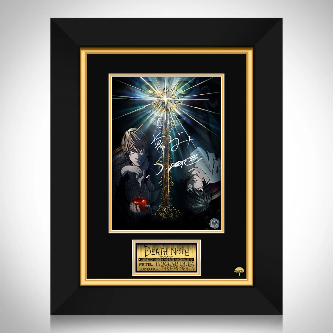 Pay homage to Death Note Promotional Art, with this gallery-framed, officially licensed, limited edition facsimile of the Hand-Signed photo, originally signed by Tsugumi Ohba and Takeshi Obata, of which is strictly limited to 100 units Worldwide, and has been approved and numbered accordingly.