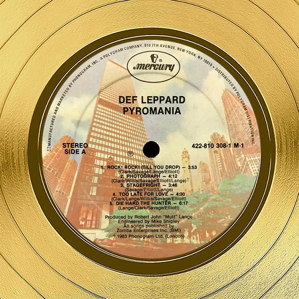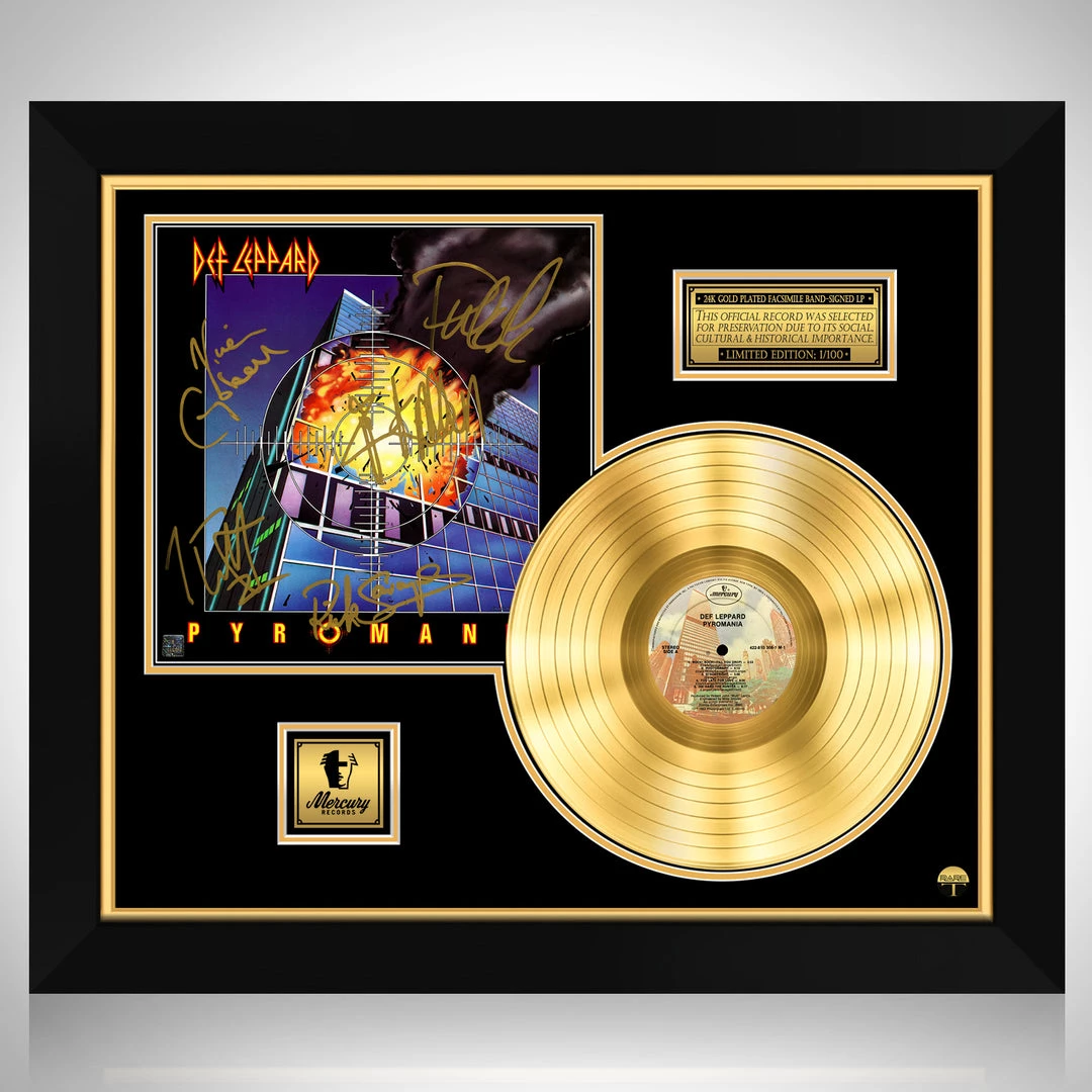 Pay homage to one of the most iconic american rock band of all time Def Leppard , with this gallery-framed, authentic Mercury Records fully licensed facsimile of the official Hand-Signed 24K Gold LP Record and LP Cover Pyromania Originally signed by Joe Elliott, Rick Allen, Phil Collen, Rick Savage & Vivian Campbell , of which is strictly limited to 100 units Worldwide and has been approved and numbered accordingly.