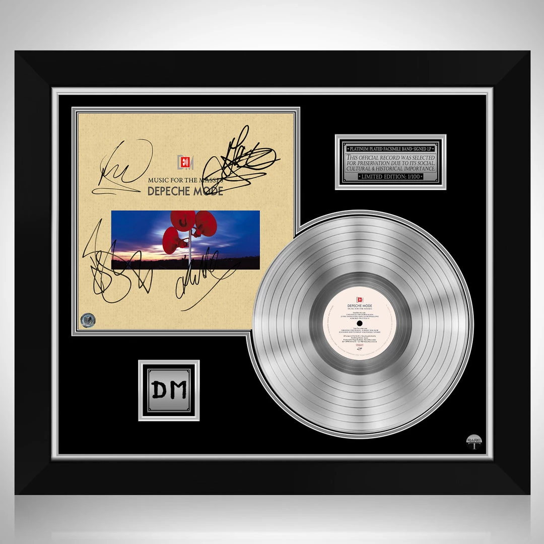 Pay homage to one of the most iconic English electronic music band of all time Depeche Mode , with this gallery-framed, authentic Mute Records fully licensed facsimile of the official Hand-Signed Platinum Plated LP Record and LP Cover Music for the Masses Originally signed by Andrew Fletcher, Martin Gore,Alan Wilder & David Gahan , of which is strictly limited to 100 units Worldwide and has been approved and numbered accordingly.