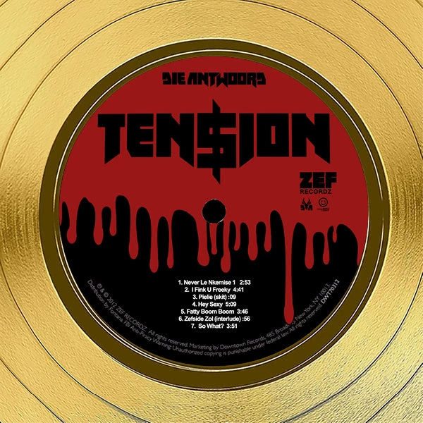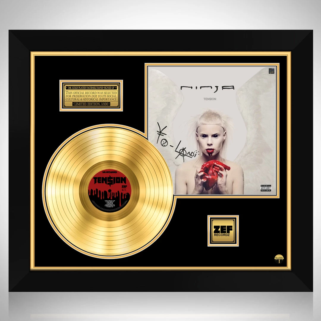 Pay homage to one of the most iconic South African hip hop group of all time Die Antwoord , with this gallery-framed, authentic Zef Recordz fully licensed facsimile of the official Hand-Signed 24K Gold LP Record and LP Cover Ten$ion Originally signed by Yolandi & Ninja , of which is strictly limited to 100 units Worldwide and has been approved and numbered accordingly.