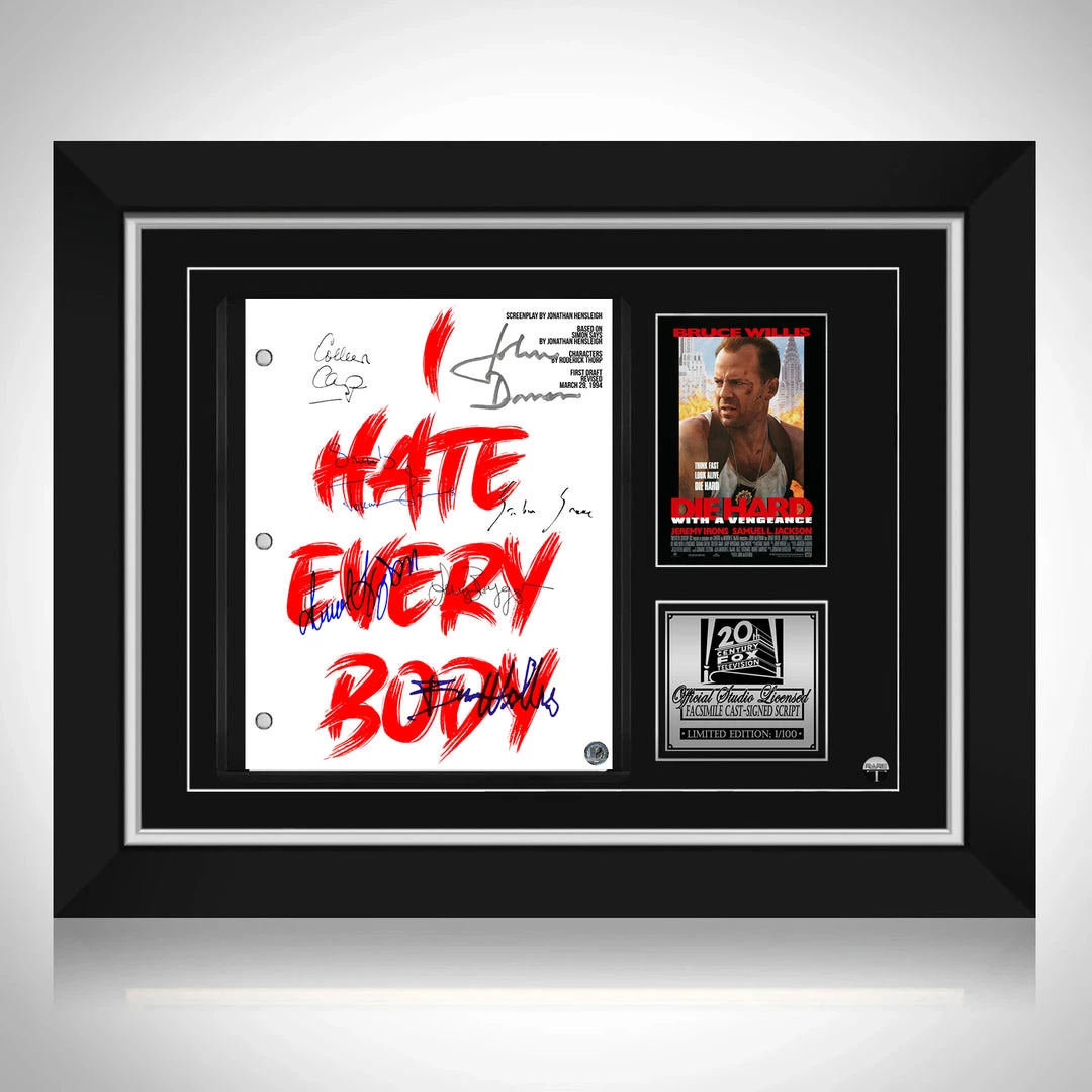 Pay homage to Die Hard with a vengeance , with this 20th Century Fox fully licensed facsimile of the official signed movie script, originally signed by actors Bruce Willis, Jeremy Irons, Samuel L.Jackson, Graham Greene, Colleen Camp, Larry Bryggman & John Doman , of which is strictly limited to 100 units Worldwide and has been approved and numbered accordingly.