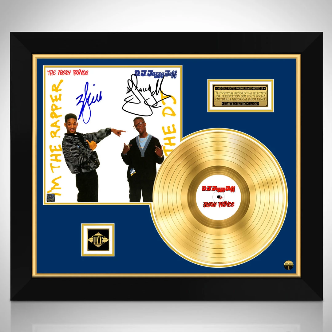 Pay homage to one of the most iconic rapper & DJ of all time DJ Jazzy Jeff & The Fresh Prince , with this gallery-framed, authentic Jive Records fully licensed facsimile of the official Hand-Signed 24K Gold LP Record and LP Cover I’m the rapper he’s the DJ Originally signed by Will Smith & Jazzy Jeff , of which is strictly limited to 100 units Worldwide and has been approved and numbered accordingly.