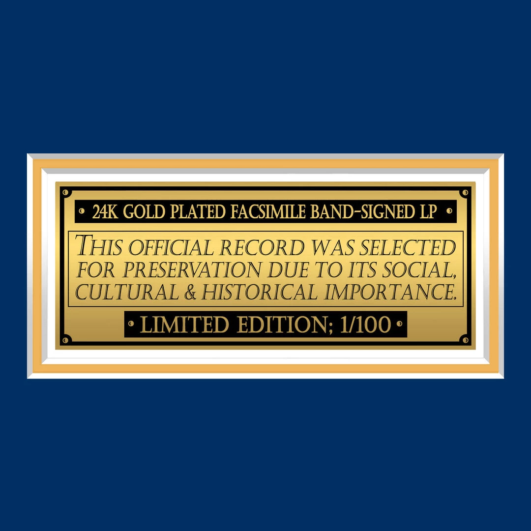 The 24K Gold LP and album cover facsimile are both professionally mounted in the highest quality triple matted wood shadow box frame with metallic fillet trim and finished with protective glass to keep it looking pristine. The customized descriptive metallic plaque, in addition to the detailed finishing and openings, add to the elegant and sophisticated gallery quality look.