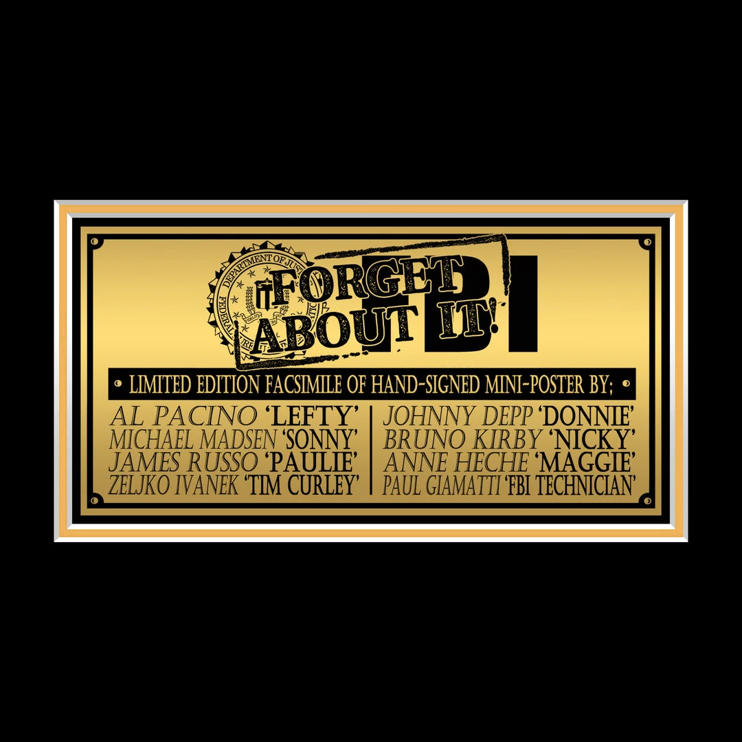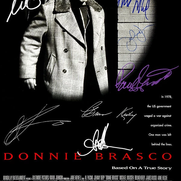 Pay homage to one of the most iconic films of all time, Donnie Brasco, with this gallery-framed, officially licensed, limited edition facsimile of hand-signed movie mini poster, originally signed by Al Pacino, Michael Madsen, James Russo, Zeljko Ivanek, Johnny Depp, Bruno Kirby, Anne Heche and Paul Giamatti, of which is strictly limited to 100 units Worldwide, and has been approved and numbered accordingly.