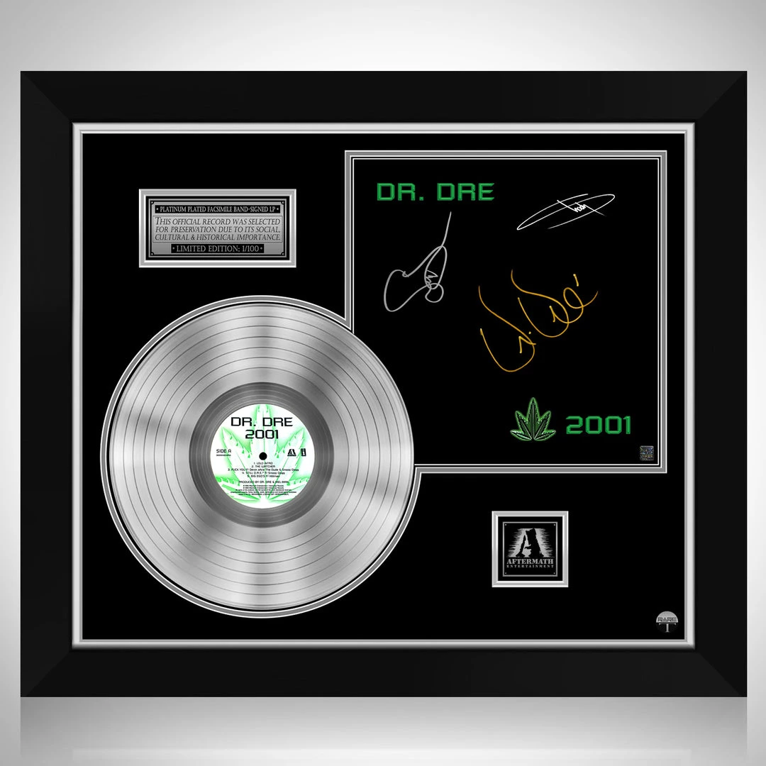 Pay homage to one of the most iconic Rap Artists of all time Dr. Dre , with this gallery-framed, authentic Aftermath Entertainment fully licensed facsimile of the official Hand-Signed Platinum Plated LP Record and LP Cover 2001 Originally signed by Dr. Dre, Snoop Dog & Eminem , of which is strictly limited to 100 units Worldwide and has been approved and numbered accordingly.