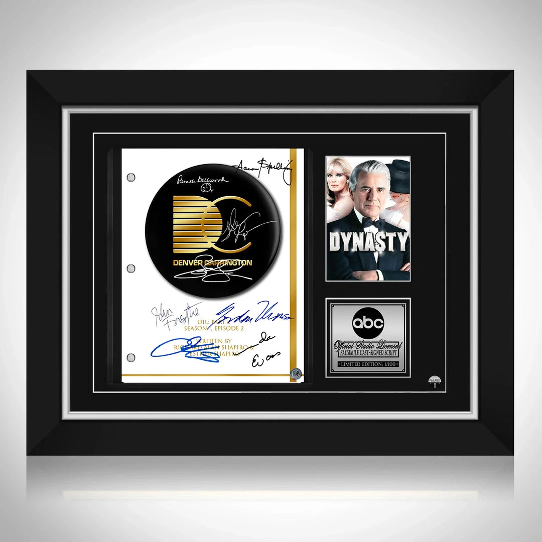 Pay homage to Dynasty , with this The CW fully licensed facsimile of the official signed TV Series script, originally signed by actors John Forsythe, Linda Evans, Joan Collins, Gordon Thomson, John James, Heather Locklear, Pamela Bellwood & Aaron Spelling , of which is strictly limited to 100 units Worldwide and has been approved and numbered accordingly.