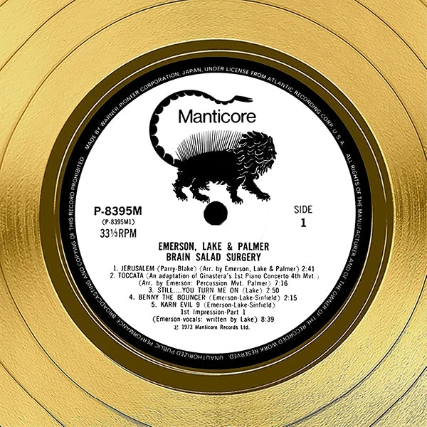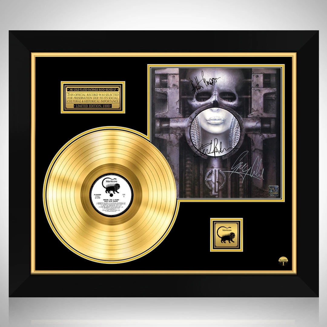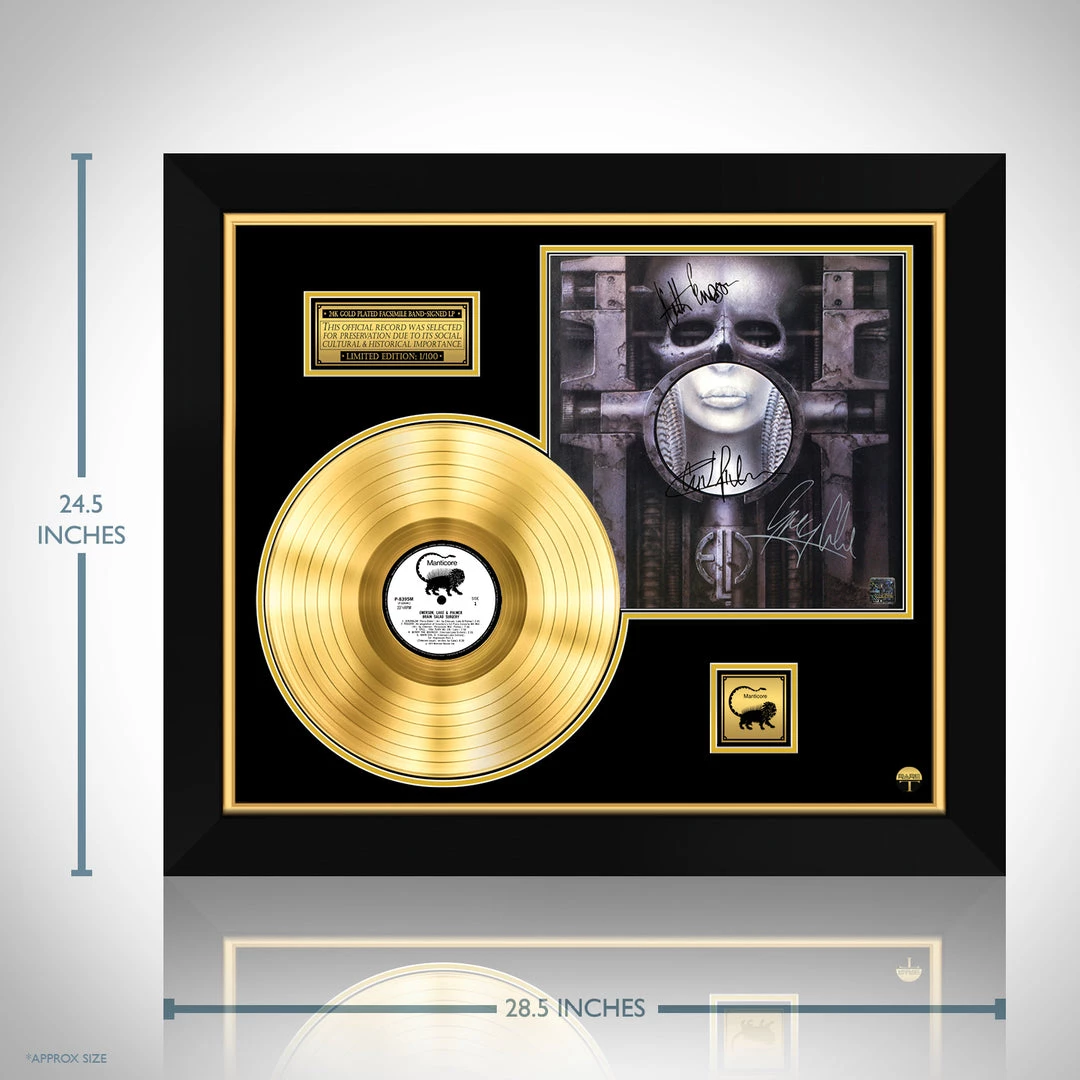 Pay homage to one of the most iconic band of all time Emerson, Lake and Palmer , with this gallery-framed, authentic Manticore Records fully licensed facsimile of the official Hand-Signed 24K Gold LP Record and LP Cover Brain Salad Surgery Originally signed by Keith Emerson, Greg Lake & Carl Palmer , of which is strictly limited to 100 units Worldwide and has been approved and numbered accordingly.