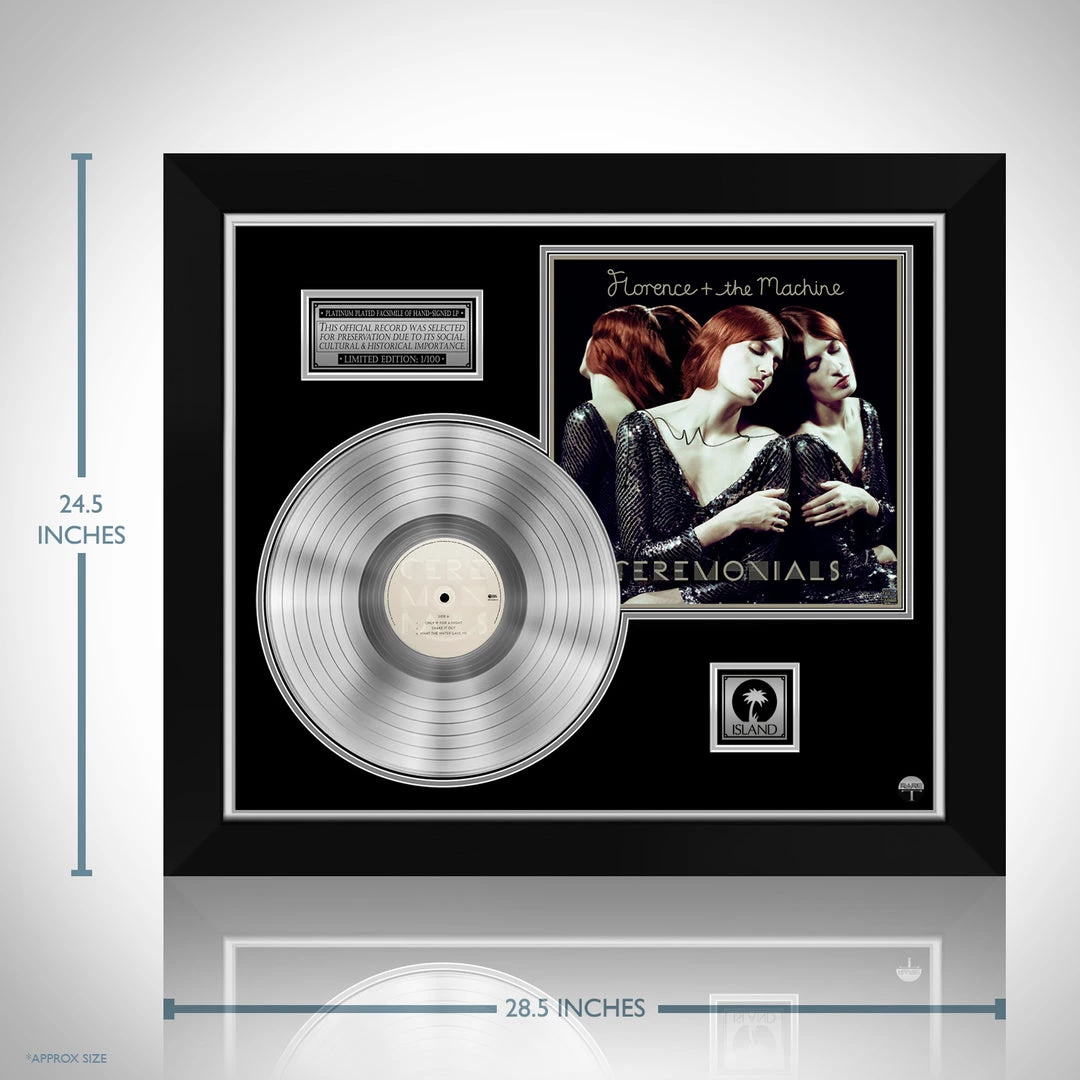 Pay homage to one of the most iconic English indie rock band of all time Florence + The Machine , with this gallery-framed, authentic Island Records fully licensed facsimile of the official Hand-Signed Platinum Plated LP Record and LP Cover Ceremonials Originally signed by Florence Welch , of which is strictly limited to 100 units Worldwide and has been approved and numbered accordingly.