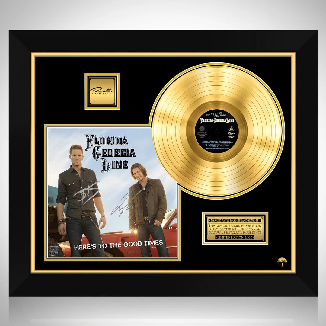 Pay homage to one of the most iconic American country duo of all time Florida Georgia Line , with this gallery-framed, authentic Republic Nashville fully licensed facsimile of the official Hand-Signed 24K Gold Plated LP Record and LP Cover Here’s To The Good Times Originally signed by Tyler Hubbard, & Brian Kelley , of which is strictly limited to 100 units Worldwide and has been approved and numbered accordingly.