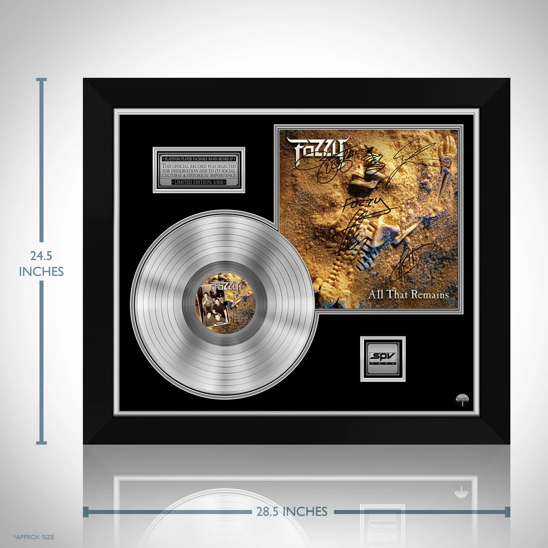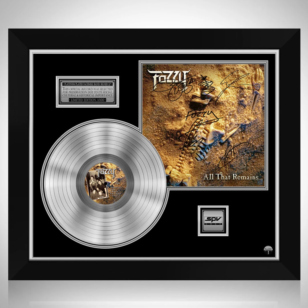 Pay homage to one of the most iconic heavy metal band of all time Fozzy , with this gallery-framed, authentic Ash Records fully licensed facsimile of the official Hand-Signed Platinum Plated LP Record and LP Cover All that Remains Originally signed by Zakk Wylde, Chris Jericho, Rich Ward & Frank Fontsere , of which is strictly limited to 100 units Worldwide and has been approved and numbered accordingly.