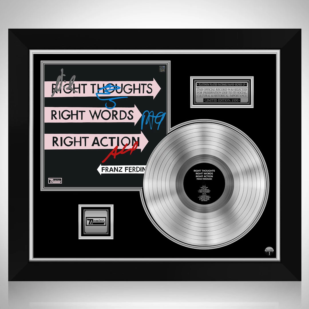 Pay homage to one of the most iconic Scottish rock band of all time Franz Ferdinand , with this gallery-framed, authentic Domino Records fully licensed facsimile of the official Hand-Signed Platinum Plated LP Record and LP Cover Right thoughts, Right Words, Right Action Originally signed by Alex Kapranos, Nick McCarthy, Bob Hardy & Paul Thomson , of which is strictly limited to 100 units Worldwide and has been approved and numbered accordingly.