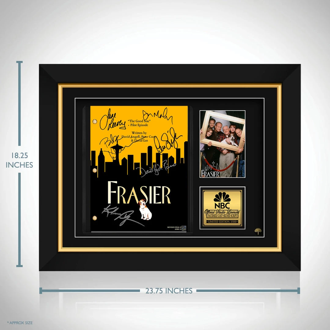 Pay homage to Frasier , with this NBC fully licensed facsimile of the official signed TV Series script, originally signed by actors Kelsey Grammer, Jane Leeves, David Hyde Pierce, Peri Gilpin, John Mahoney & Bebe Neuwirght , of which is strictly limited to 100 units Worldwide and has been approved and numbered accordingly.