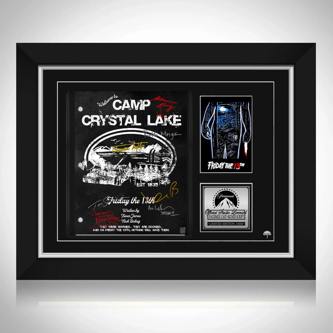 Pay homage to Friday 13th (1980) , with this Paramount Pictures fully licensed facsimile of the official signed movie script, originally signed by actors Betsy Palmer, Adrienne King, Jeannine Taylor, Robbi Morgan, Kevin Bacon, Ari Lehman & Tom Savini , of which is strictly limited to 100 units Worldwide and has been approved and numbered accordingly.