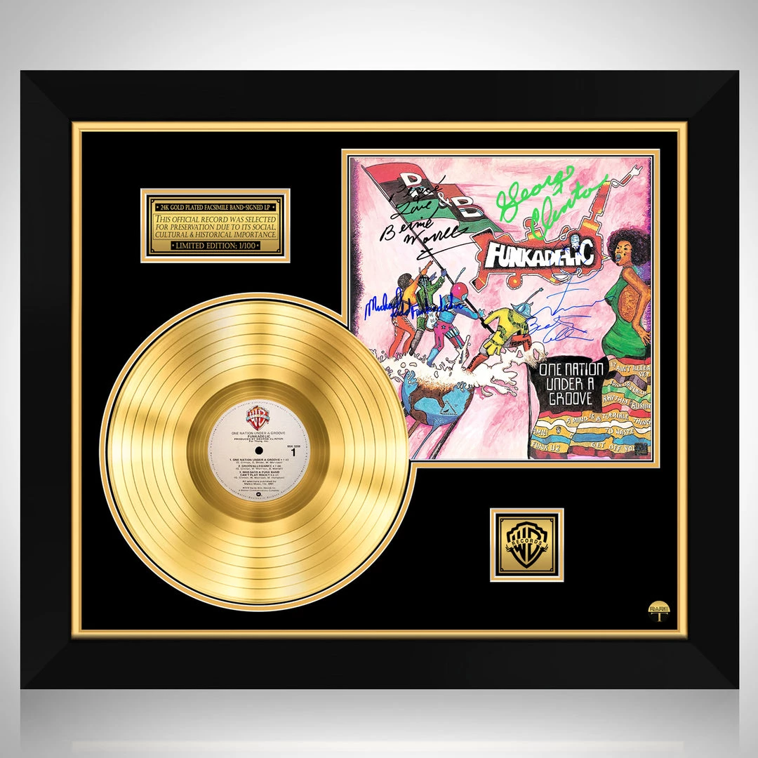 Pay homage to one of the most iconic American funk rock band of all time Funkadelic , with this gallery-framed, authentic Warner Bros Records fully licensed facsimile of the official Hand-Signed 24K Gold LP Record and LP Cover One Nation under a Groove Originally signed by George Clinton, Mike Hampton, Bernie Worrel & William Bootsy Collins , of which is strictly limited to 100 units Worldwide and has been approved and numbered accordingly.