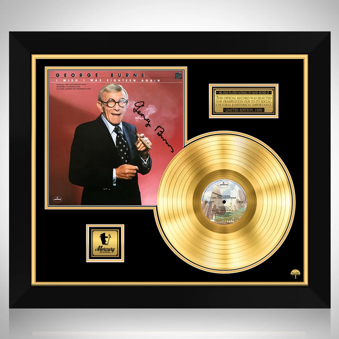 Pay homage to one of the most iconic American comedian, actor, singer, writer of all time George Burns , with this gallery-framed, authentic Mercury Records fully licensed facsimile of the official Hand-Signed 24K Gold LP Record and LP Cover I Wish I Was 18 Again Originally signed by George Burns , of which is strictly limited to 100 units Worldwide and has been approved and numbered accordingly.