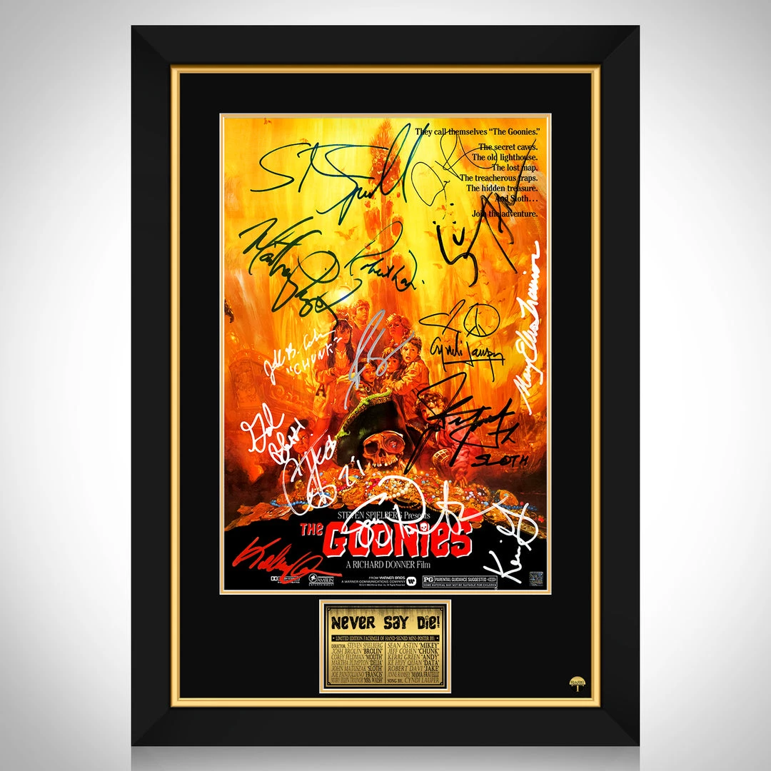 — Originally signed by Steven Spielberg, Josh Brolin, Cory Feldman, Martha Plimpton, John Matuszak, Joe Pantoliano, Mary Ellen Trainor, Sean Astin, Jeff Cohen, Kerri Green, Ke Huy Quan, Robert Davi, Anne Ramsey and Cyndi Lauper