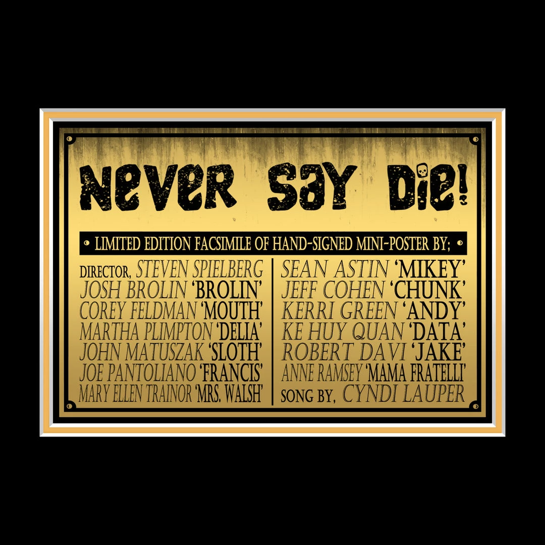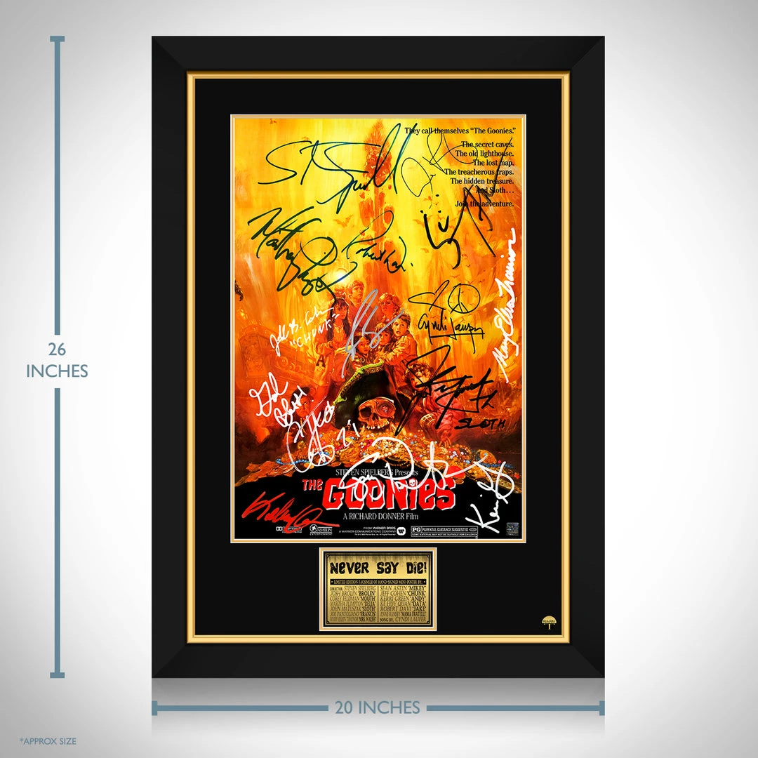 Pay homage to Goonies with this gallery-framed, officially licensed, limited edition facsimile of hand-signed mini poster, originally signed by Steven Spielberg, Josh Brolin, Cory Feldman, Martha Plimpton, John Matuszak, Joe Pantoliano, Mary Ellen Trainor, Sean Astin, Jeff Cohen, Kerri Green, Ke Huy Quan, Robert Davi, Anne Ramsey and Cyndi Lauper, of which is strictly limited to 100 units Worldwide, and has been approved and numbered accordingly.