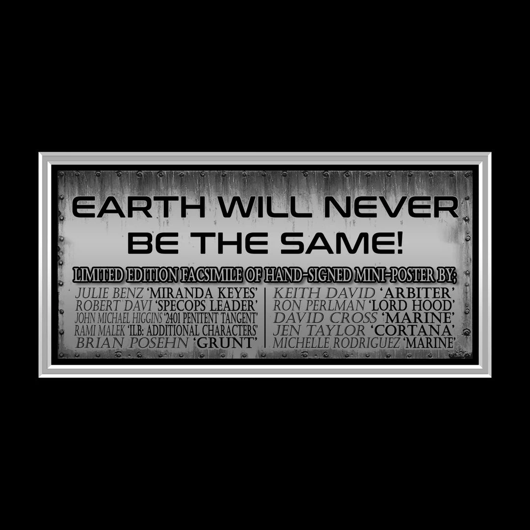 Pay homage to one of the most iconic games of all time, Halo 2, with this gallery-framed, officially licensed, limited edition facsimile of hand-signed mini poster, originally signed by Julie Benz, Robert Davi, John Michael Higgins, Rami Malek, Brian Posehn, Keith David, Ron Pearlman, David Cross, Jen Taylor & Michelle Rodriguez, of which is strictly limited to 100 units Worldwide, and has been approved and numbered accordingly.