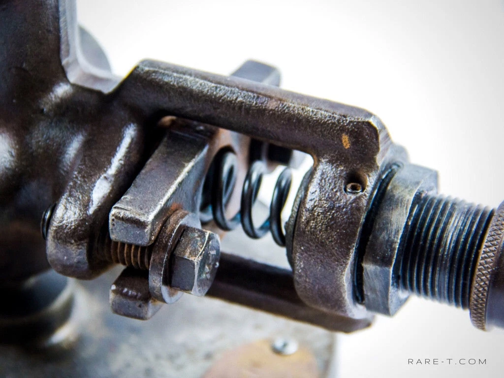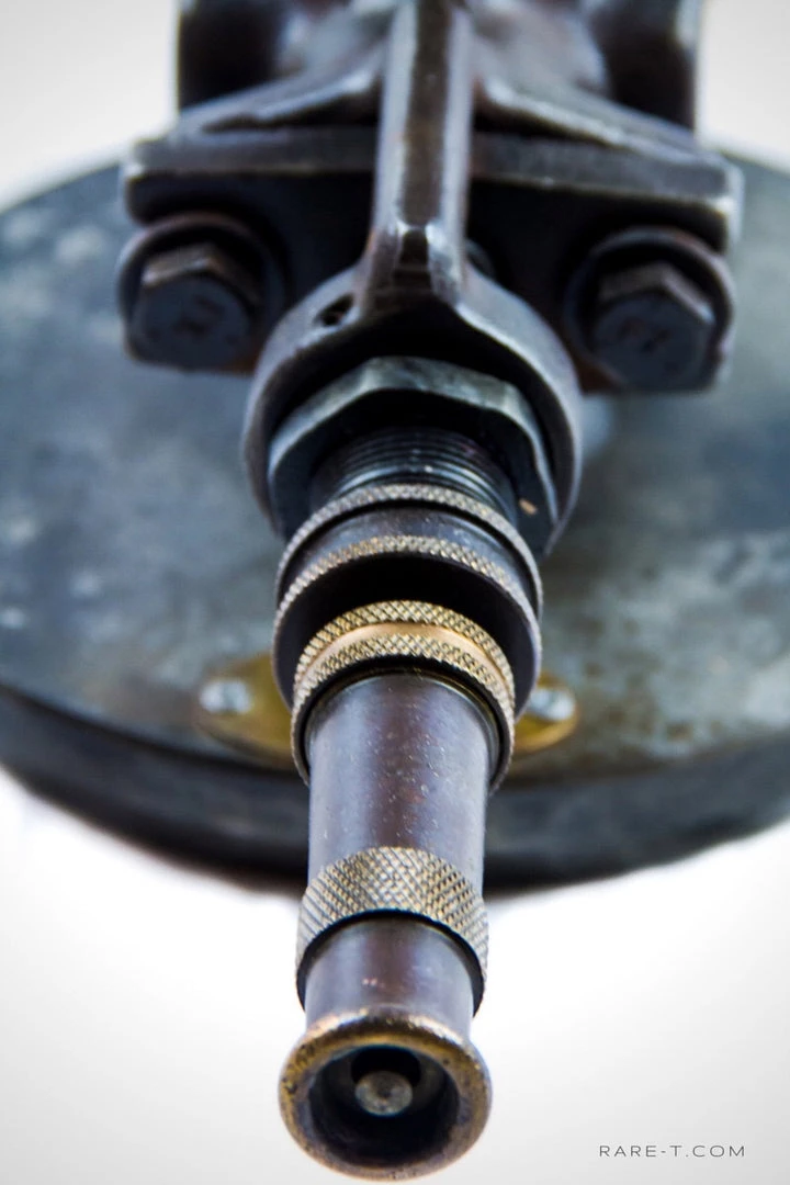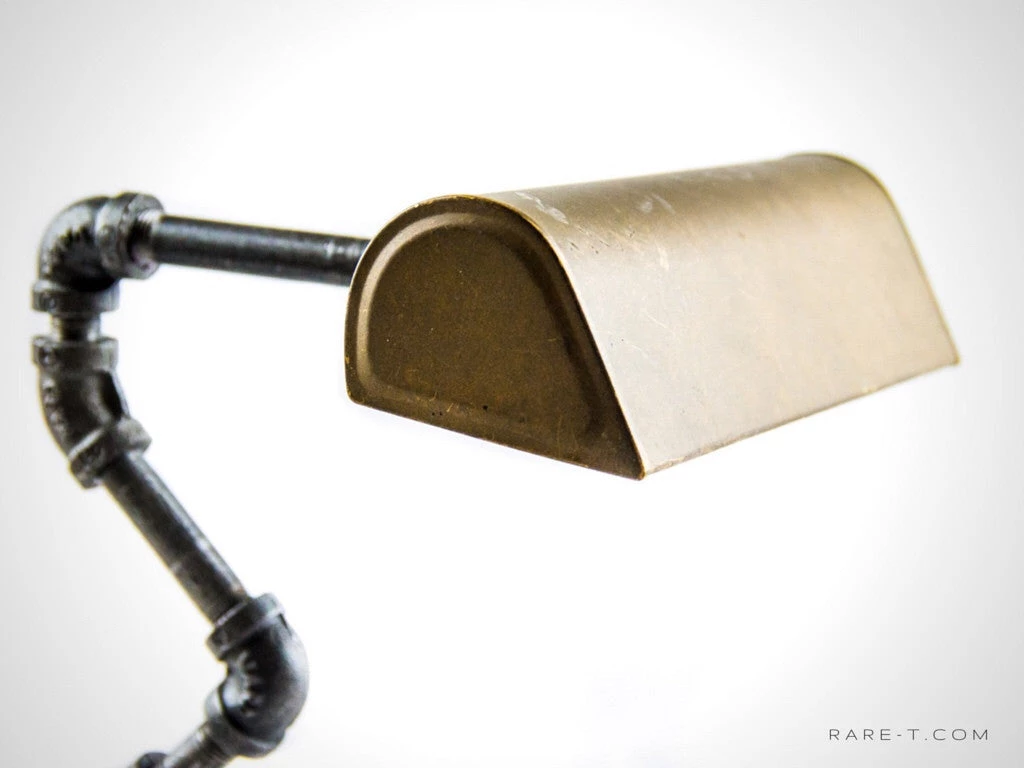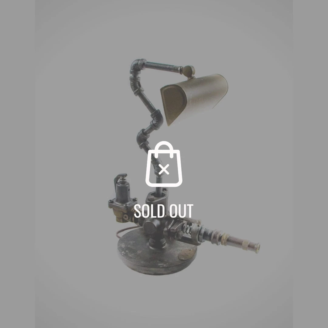 This 18-inch tall, handmade 25w STEAMPUNK-INDUSTRIAL lamp is a one of a kind work of art. Assembled in 2014 from various re-purposed vintage brass and black iron ‘machine age’ parts, then rewired and topped-off with a clear coat to protect its perfect patina.