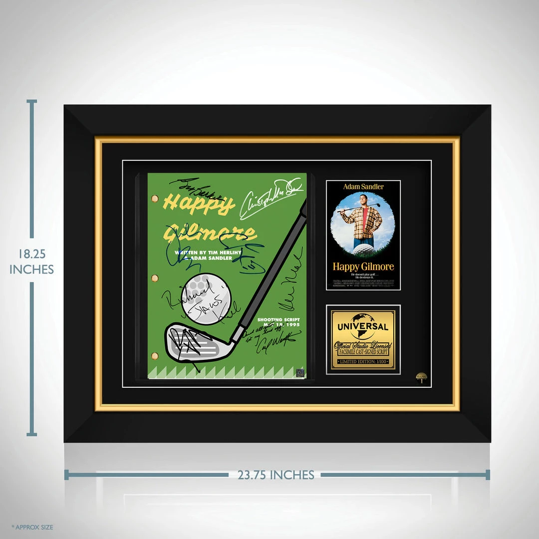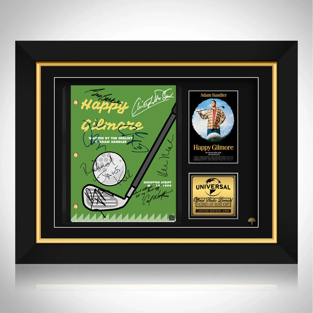 Pay homage to Happy Gilmore , with this Universal Pictures fully licensed facsimile of the official signed movie script, originally signed by actors Adam Sandler, Christopher McDonald, Julie Bowen, Carl Weathers, Bob Barker, Richard Kiel, Kevin Nealon & Ben Stiller , of which is strictly limited to 100 units Worldwide and has been approved and numbered accordingly.